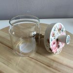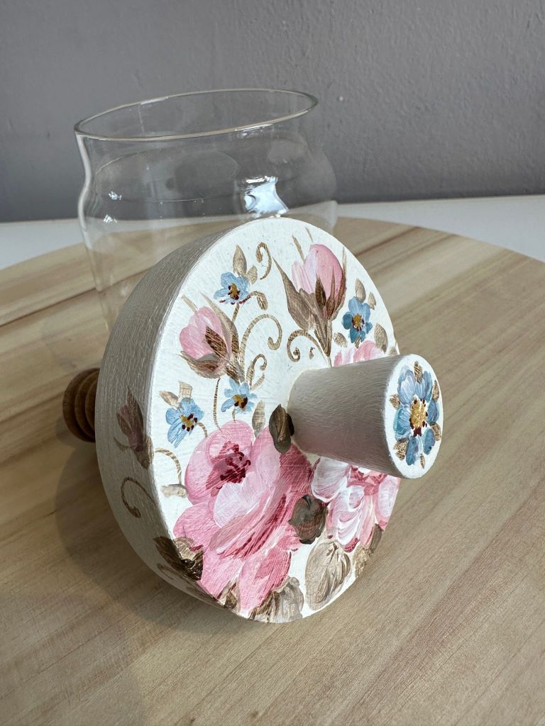 Borcanel de miere din sticla cu capac din lemn, pictat manual cu trandafiri roz pastel pe fundal alb. Foarte estetic si util, betisorul pentru miere este atasat de capac. Se poate curata cu un burete umed. A nu se baga capacul la masina de spalat vase. Are dimensiunile de 13 cm inaltime si 9 cm diametru.
