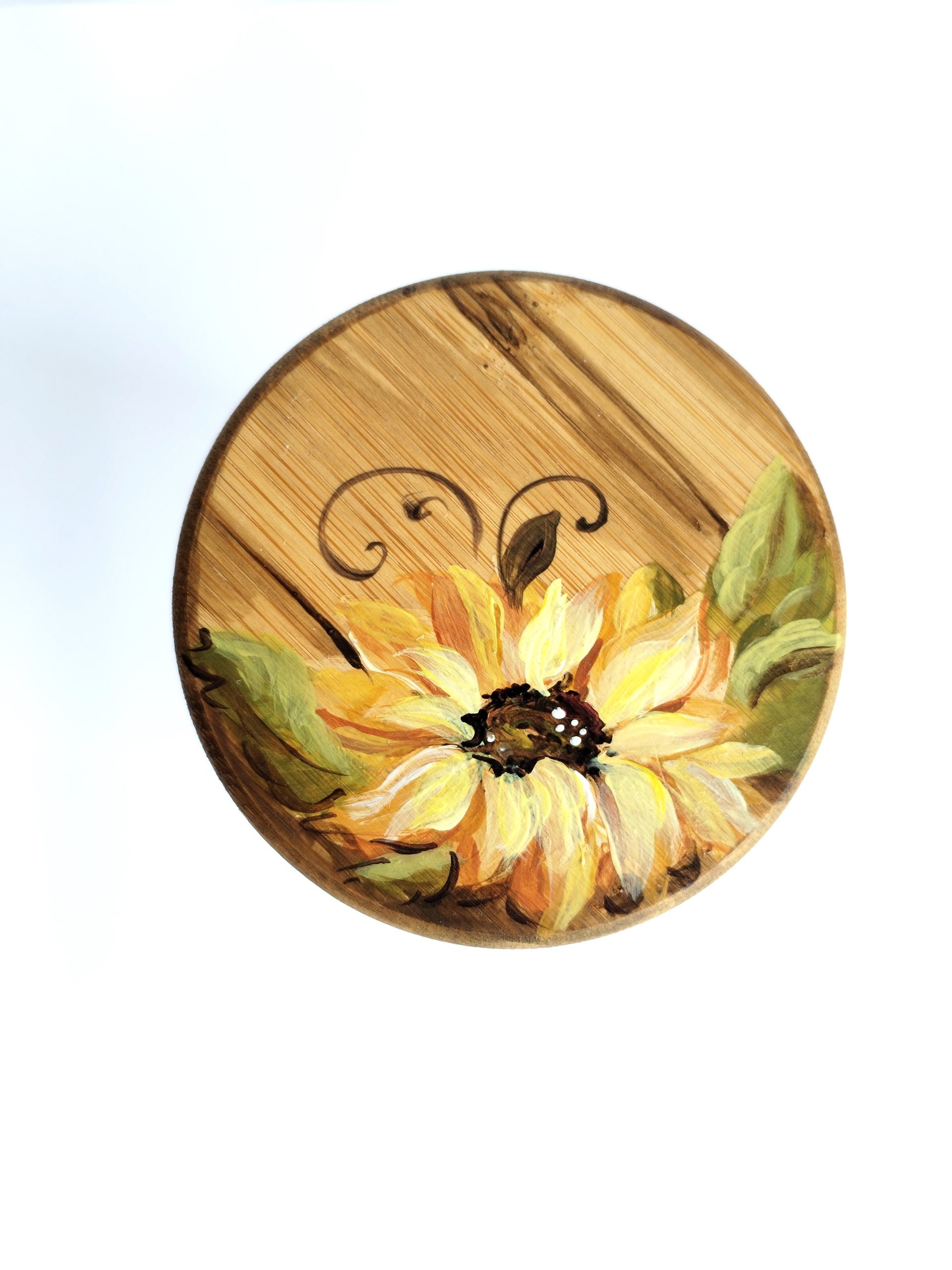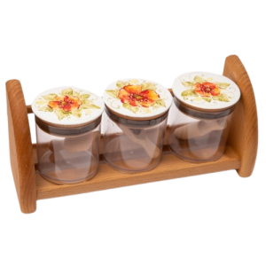 Borcanel din sticla cu capac din lemn, pictat manual cu floarea soarelui. Capacul are o garnitura care inchide borcanul etans. Ideal ca si recipient pentru ceaiuri, condimente, seminte, dulciuri si multe altele, fiind in acelasi timp estetic si util.