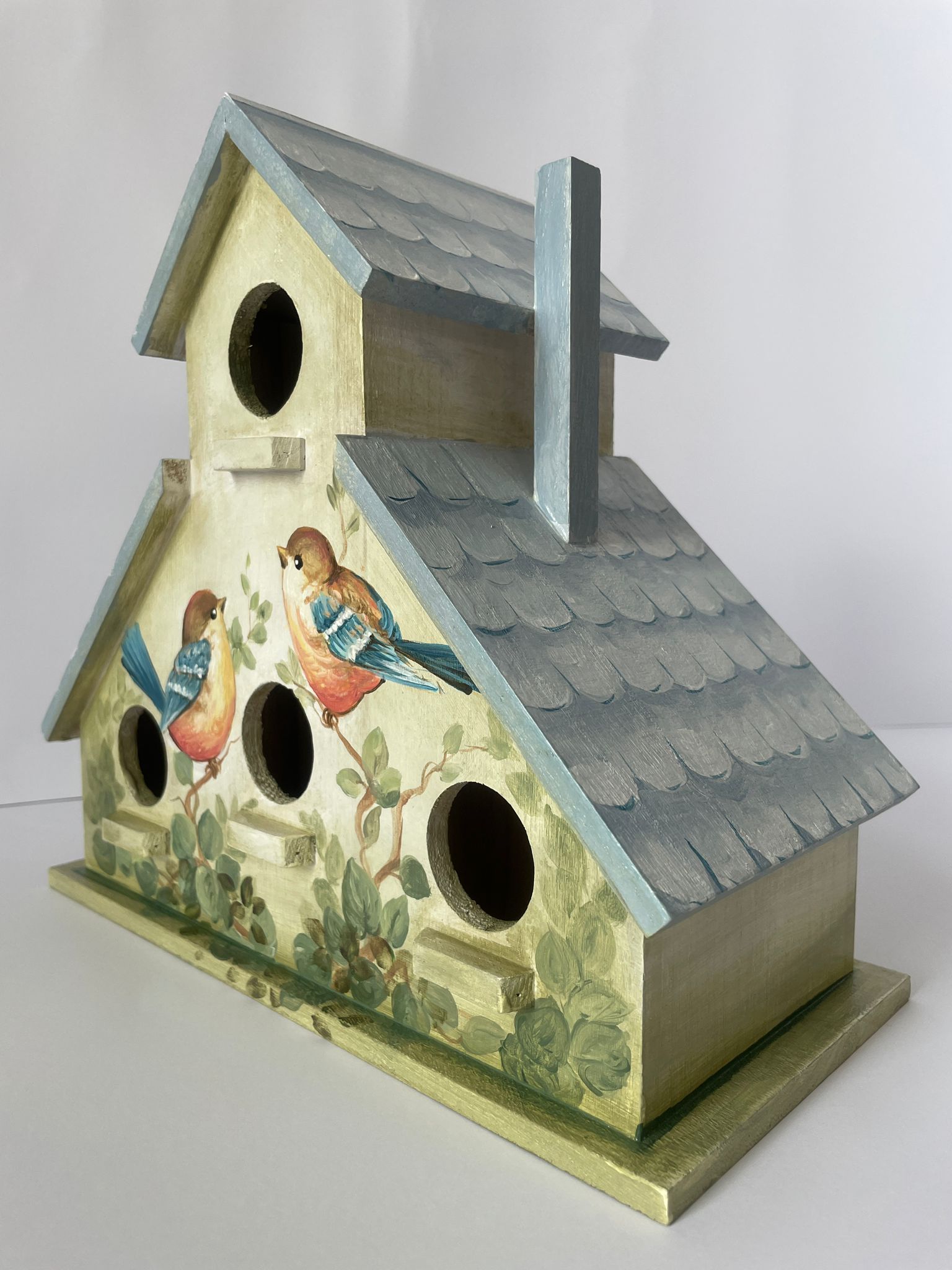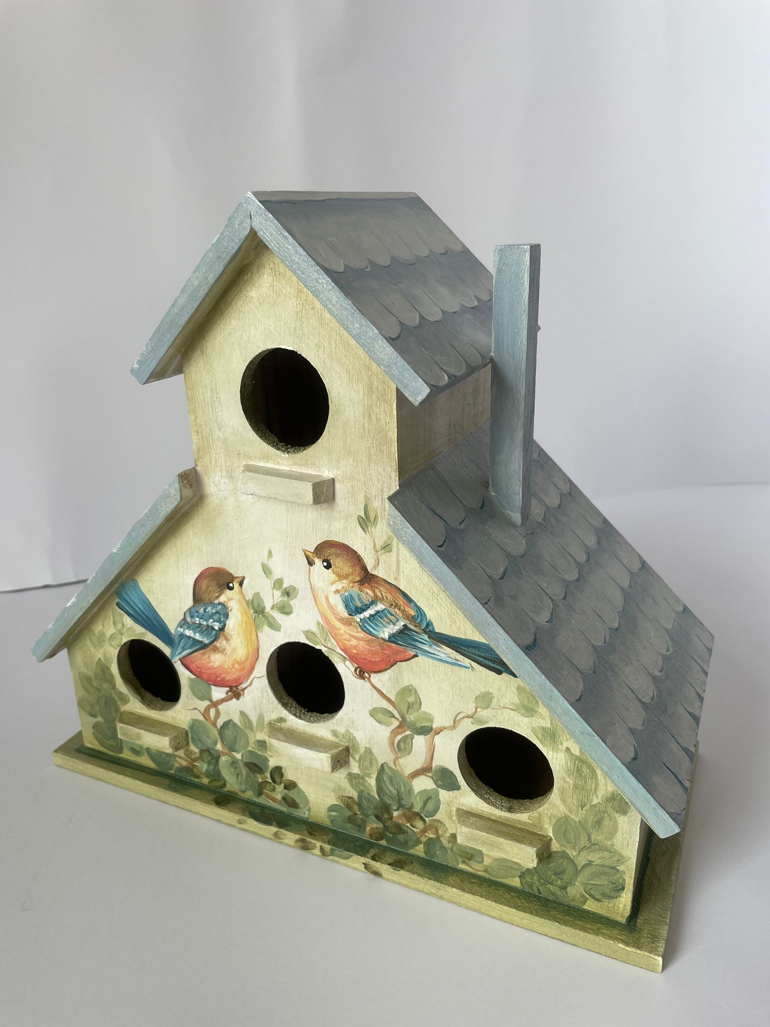 Casuta de lemn pentru pasari. Pictata manual. Se poate agata in spatii exterioare.
