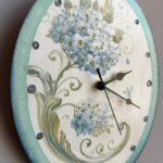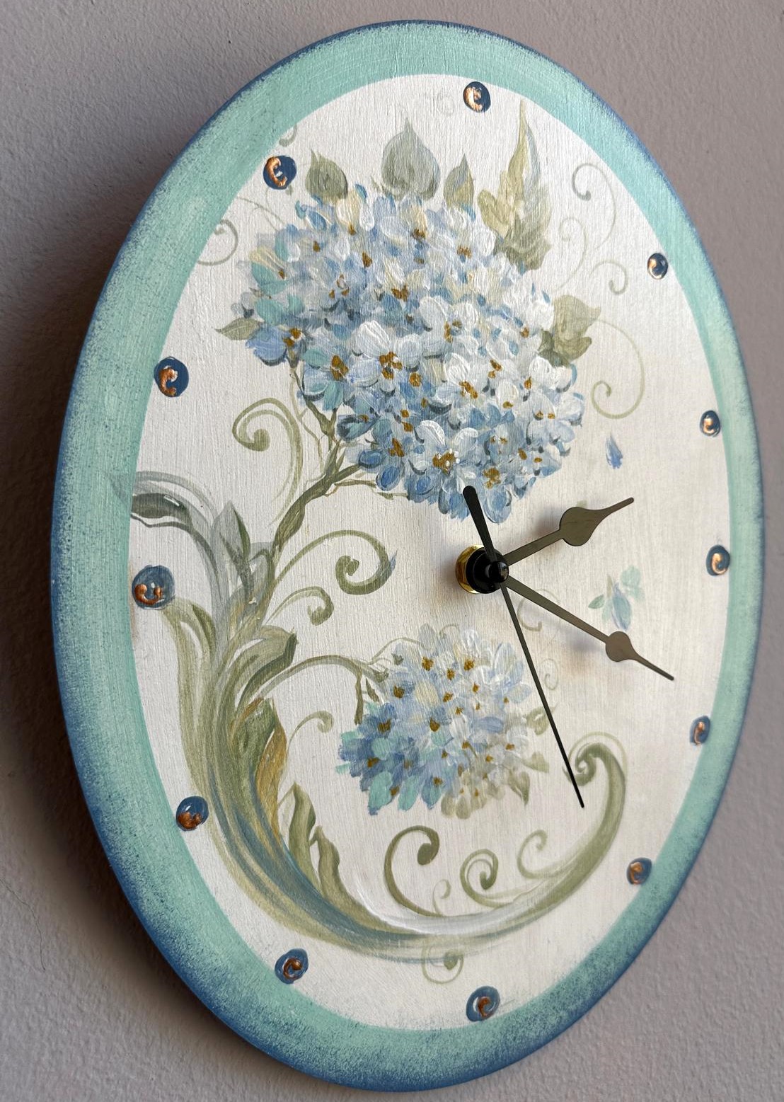 Ceas oval din lemn, pictat manual cu hortensii si detalii albastre. Ideal pentru bucatarie. hol. living, birou. Poate deveni un cadou memorabil cu tematica florala, pentru o persoana draga. Acest ceas oval ca un mic tablou este surpriza ideala.