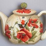 Ceas tip ceainic, din lemn, pictat manual cu maci. Ideal pentru orice bucatarie, se poate agata pe perete. Ornamentele si patina ofera ceainicului un aspect fin si elegant, iar pictura da aspect de ceainic de portelan.