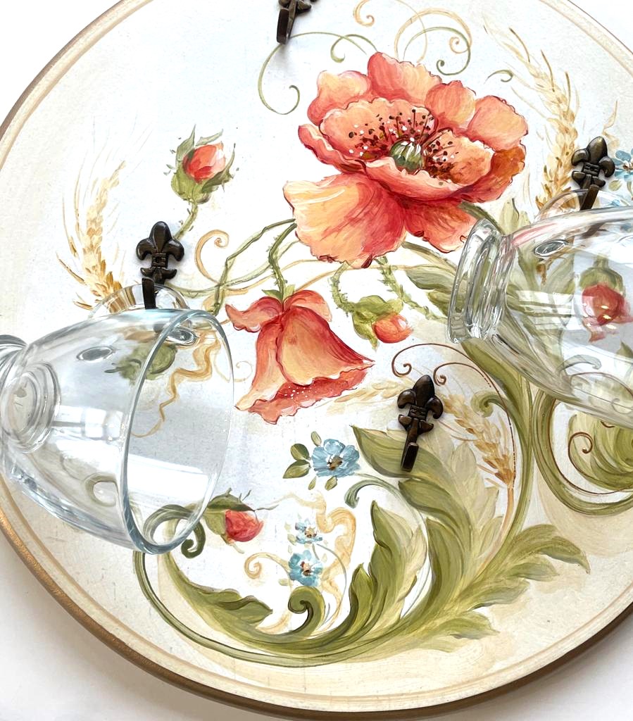 Cuier rotund de lemn ,pictat si patinat manual cu flori de mac . Produs Suba Decor cu dimensiune de 35cm diametru . Este prevazut cu patru agatatori ,ideal de agatat cesti ,chei sau prosoape. Poate fi un decor unic si practic in casa ta dar si cadoul perfect!