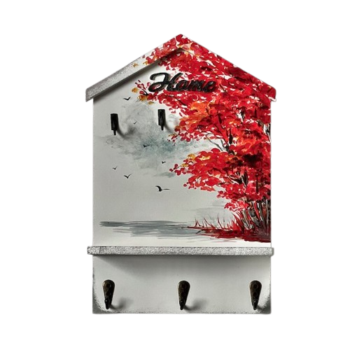 Cuier de perete din lemn, pictat manual cu peisaj de toamna cu mesteceni in nuante de gri, rosu si negru. Pictat manual de catre artistii atelierului Suba Decor, aduce o frumusete si un design aparte oricarei incaperi.