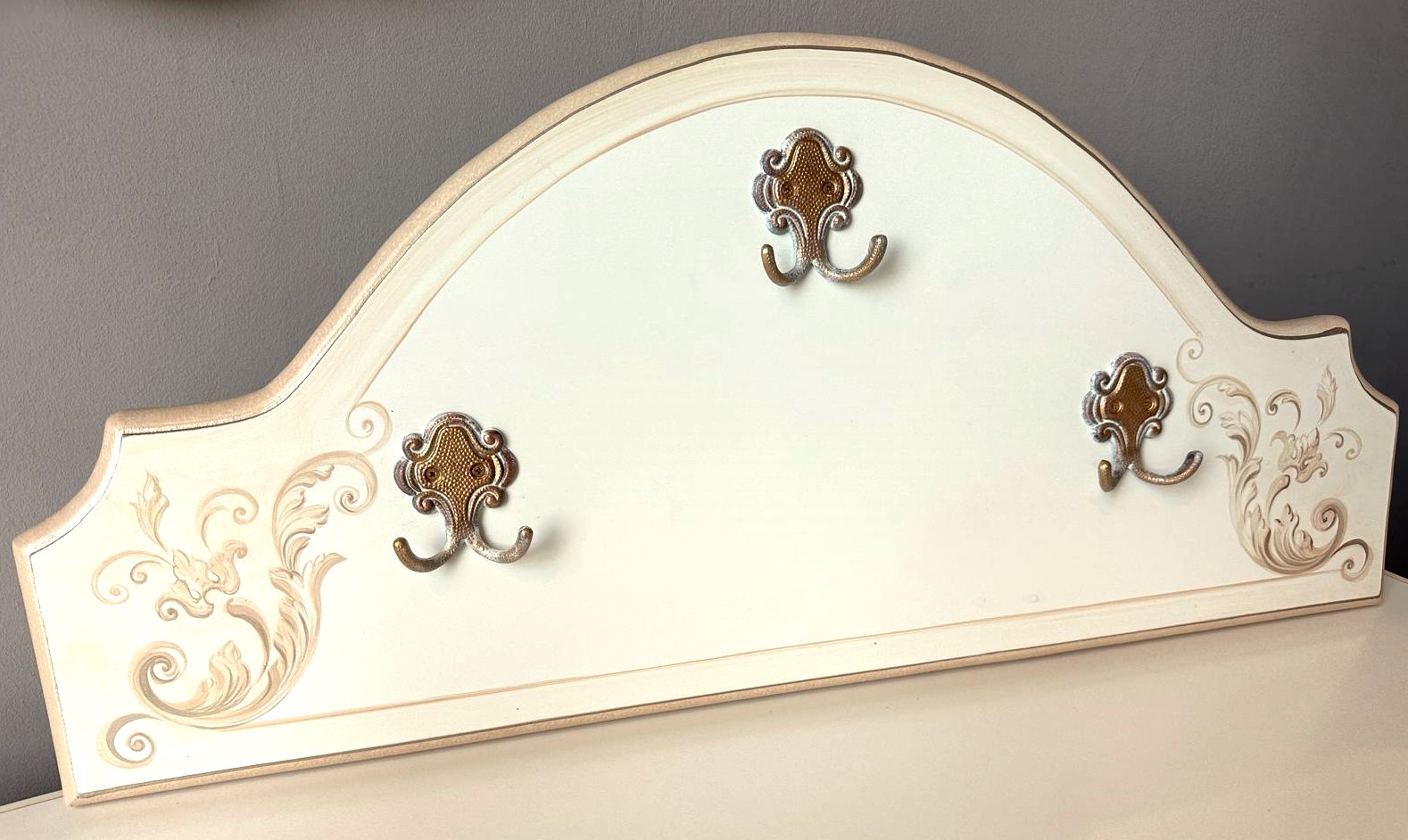 Cuier din lemn, pictat manual cu ornament bej si accente argintii. Adaugă un aspect încântător oricărui decor interior. Finisajul patinat conferă piesei o autenticitate. Cu cei doi agățători metalici rezistenți, prinși cu șuruburi, acest cuier vă oferă suficient spațiu pentru a agăța hainele, jachetele, fularele sau alte obiecte vestimentare și accesorii. Are dimensiunile de 72 cm x 32 cm. Este ideal în holul de intrare, în dormitor sau în orice altă cameră. Pictat manual in atelierul Suba Decor.