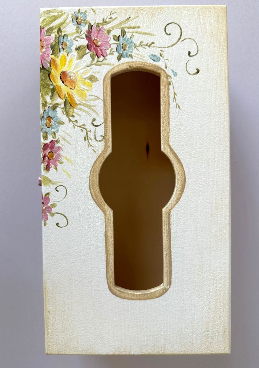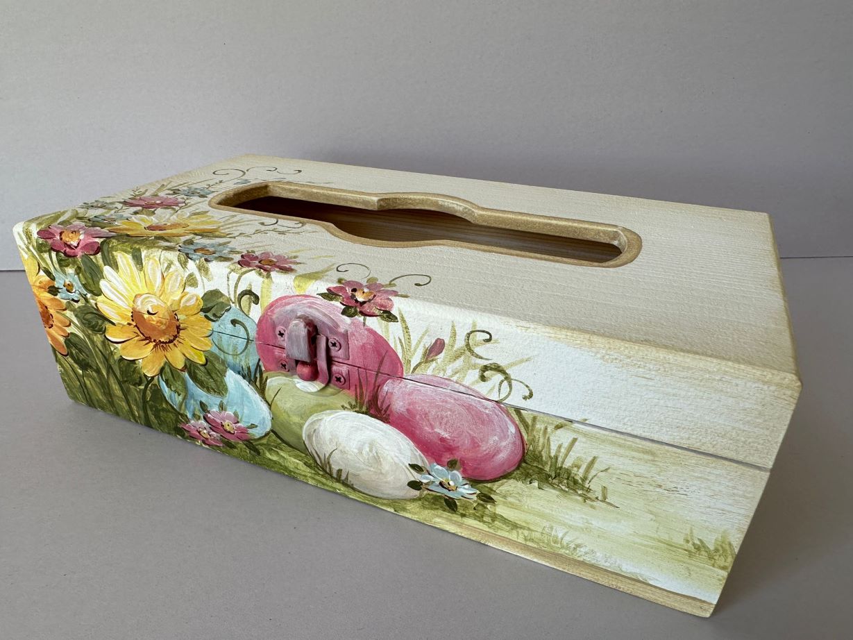 Cutie de servetele pictata manual cu tematica de Paste. Cutia este facuta din lemn rezistent, pictata in culori acrilice de calitate. Asadar, isi pastreaza aspectul pe parcursul timpului, si nu se decoloreaza sau pateaza. Este acoperita cu un strat de lac protector, usor lucios, menit sa protejeze piesa.