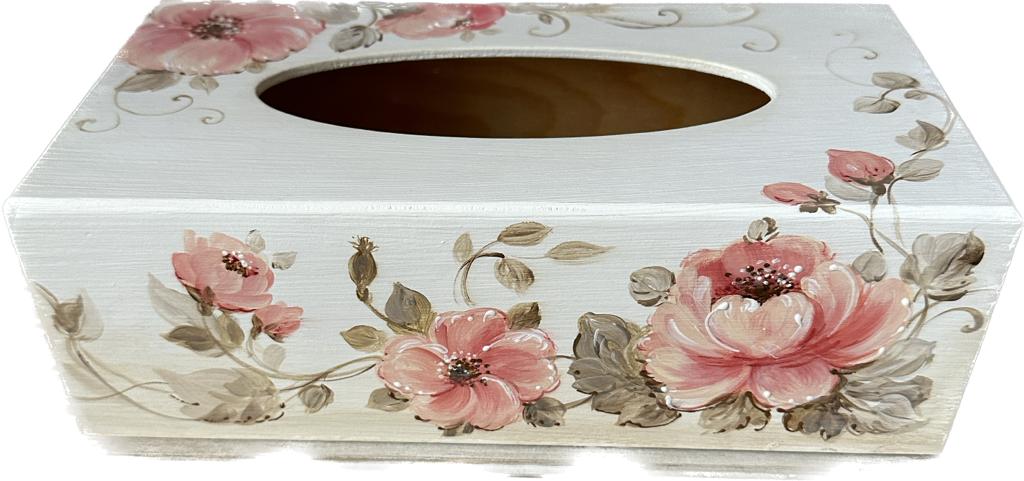 Cutie de servetele pictata manual cu trandafiri salbatici, de nuanță coral sau piersicuta. Trandafirii pictați se întind pe suprafața cutiei, și îi oferă un aspect elegant și delicat, care se potrivește într-un decor clasic sau modern.