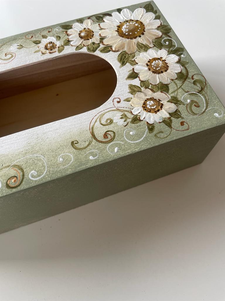 Cutie de lemn pentru servetele. Cutia este realizata in atelierul Suba Decor pictata manual cu flori de margarete si patinata in nuante discrete de verde. Dimensiunea acesteia este de 25-13-8cm. Este o cutie suport servetele unica, ideala in ambientul casei tale . Poate fi cadoul perfect unei persoane dragi!