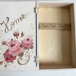 Cutie din lemn pentru chei si plicuri sau carti de vizita, pictata manual cu trandafiri roz pe fundal alb, si detalii aurii. Partea exterioara ofera loc pentru plicuri sau diverse obiecte marunte, iar pe interior se pot agata chei. Se poate aseza pe hol sau la intrare, si are rol estetic dar si practic.