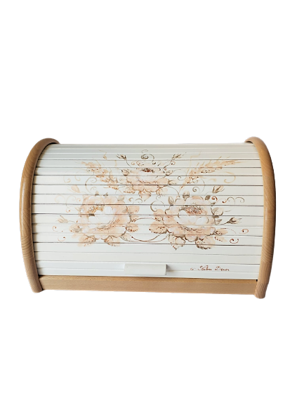Cutie pentru paine din lemn, pictata manual cu trandafiri si spice de grau bej deschis, si accente cu auriu. Cu aspect elegant si delicat, se potriveste in orice bucatarie. are dimensiunile de 39x25x21cm. Pictata in atelierul Suba Decor.cutie