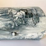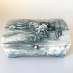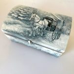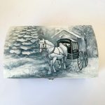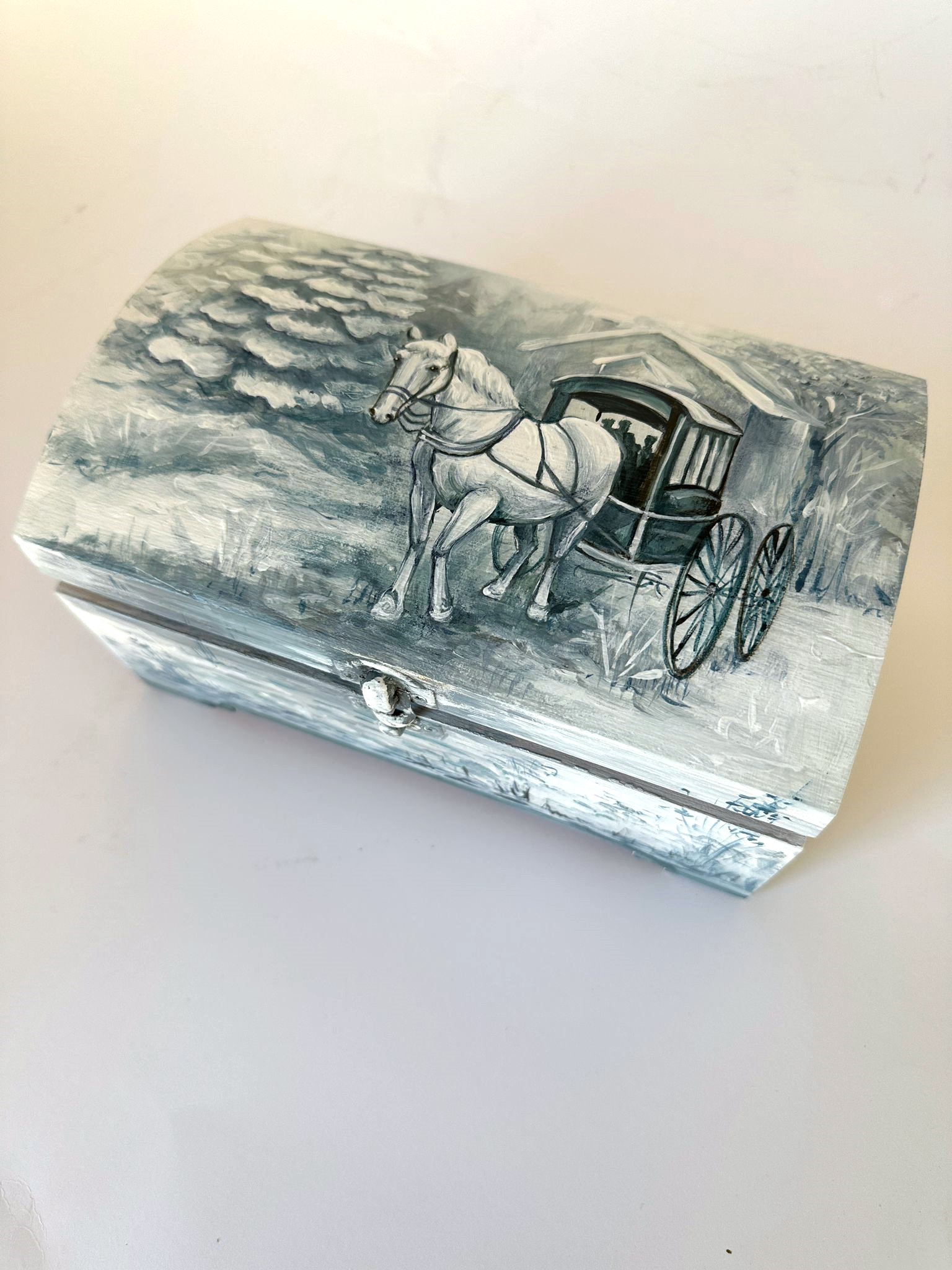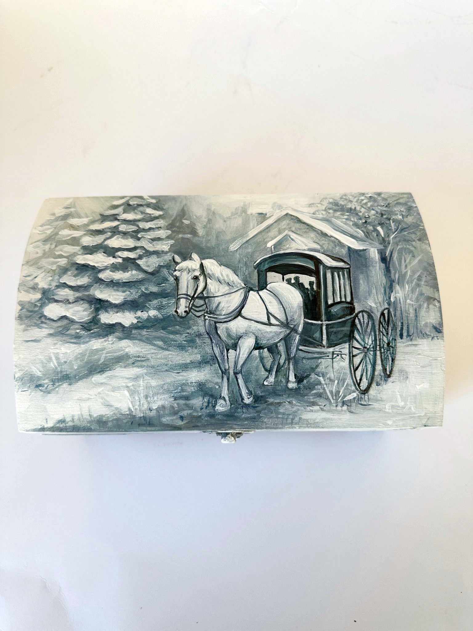 Cutie din lemn pictata manual cu peisaj de iarna si trasura trasa de cal. Cutia este alba si usor patinata, cu pictura pe capac dar si pe laterale.
