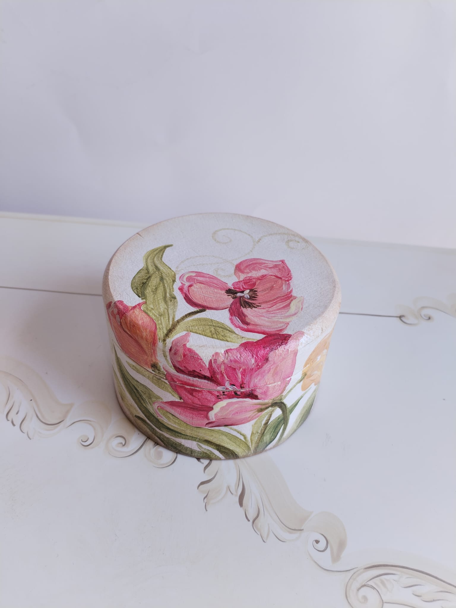 Cutie rotunda din lemn, pictata cu lalele