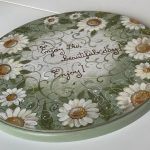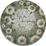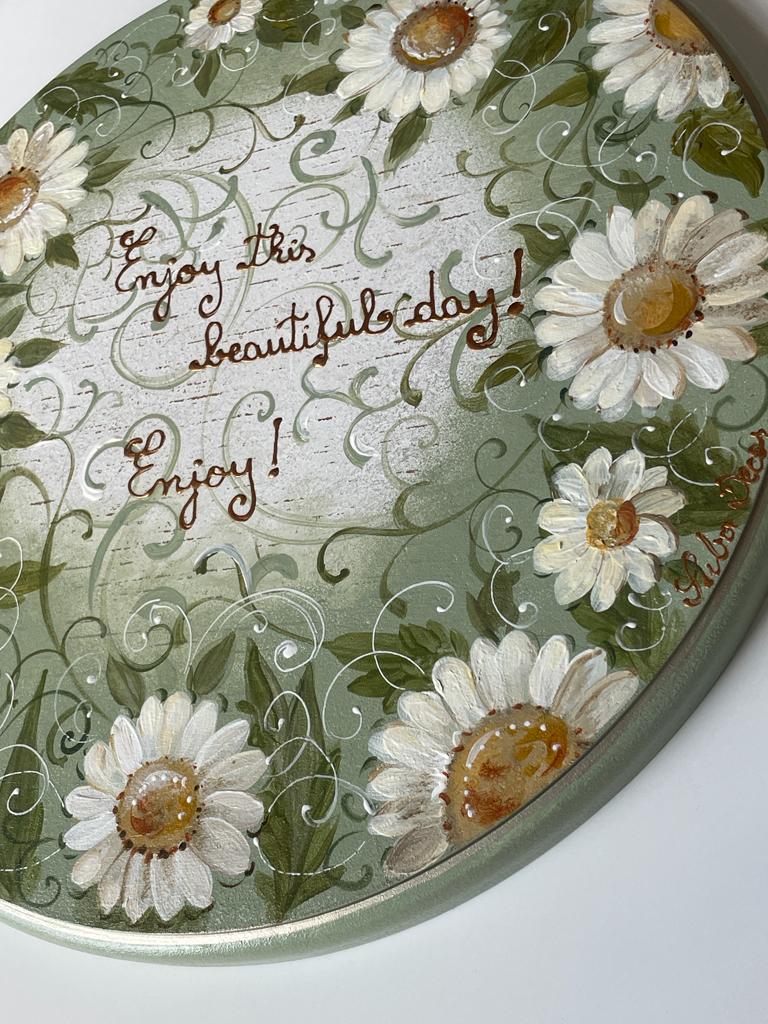 Platou de lemn pictat si patinata manual.Poate fi asezata pe perete sau platou servire , decorare. Pictat si patinat manual Suba Decor cu tematica flori de margarete . Un obiect unic si deosebit in decorarea si personalizarea casei tale sau un cadou perfect cuiva drag. Poate fi un tablou deosebit pe peretele unei camere sau un platou servire pe masa. Dimensiunea suportului este de 35 cm diametru.