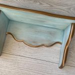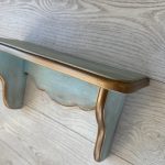 Etajera albastra pastel, patinată usor cu brun si cu dungi aurii. Cu o estetică ce amintește de perioadele clasice, aduce eleganța în contemporan. Formele rafinate și culorile sofisticate creează un cadru deosebit în orice încăpere. Auriul adaugă strălucire, iar patina fină oferă o senzație de autenticitate.