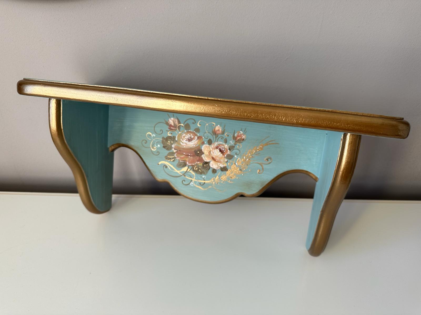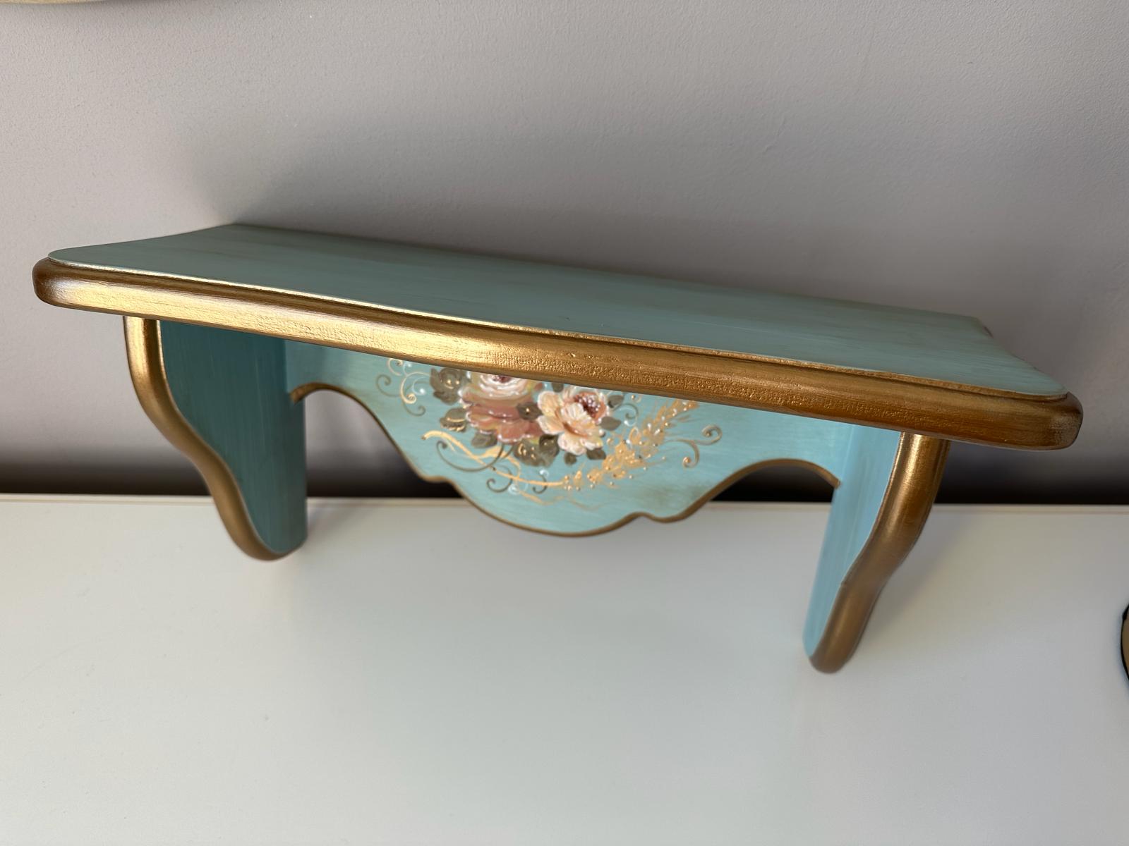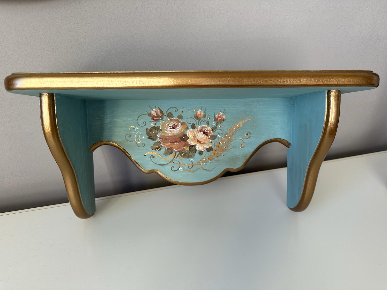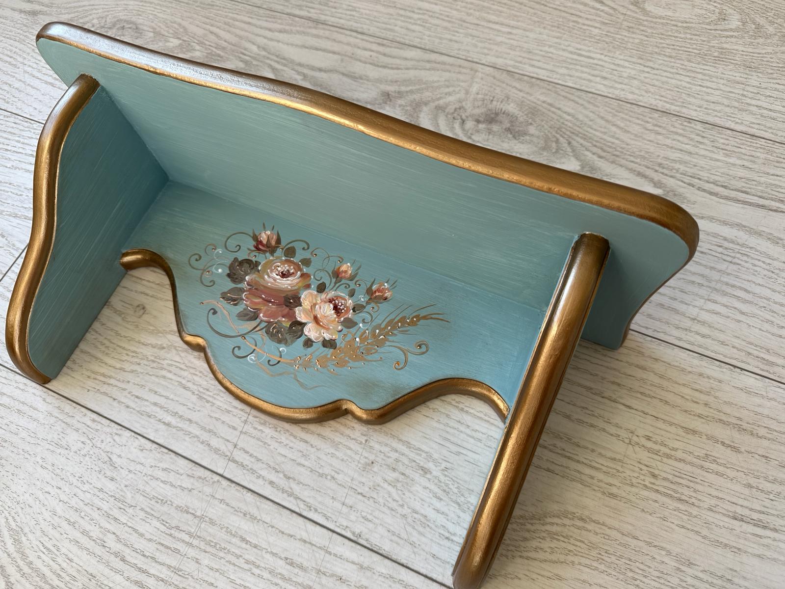 Etajera albastra pictata manual cu trandafiri pastel, patinată usor cu brun si cu dungi aurii. Cu o estetică ce amintește de perioadele clasice, aduce eleganța în contemporan. Formele rafinate și culorile sofisticate creează un cadru deosebit în orice încăpere. Auriul adaugă strălucire, iar patina fină oferă o senzație de autenticitate.