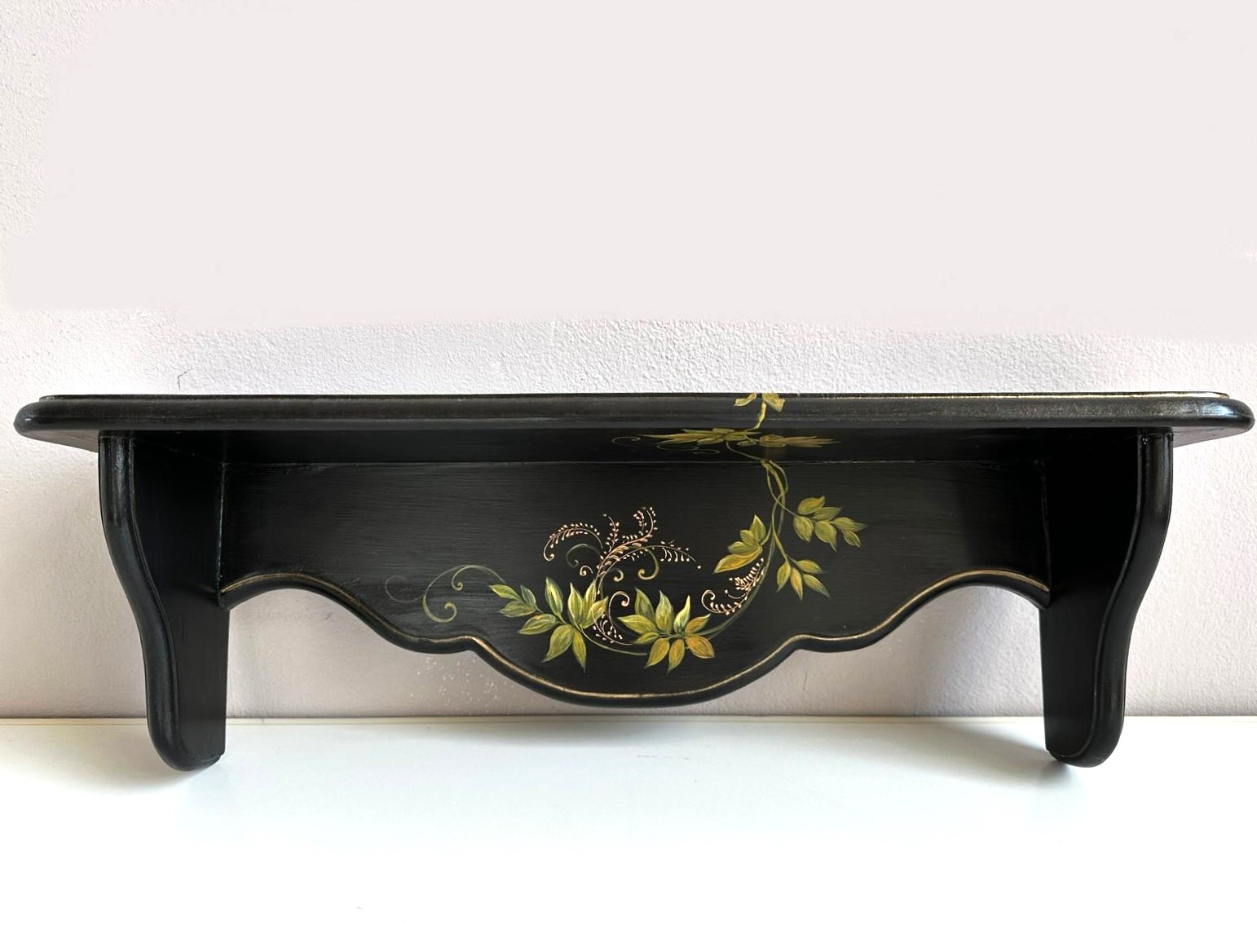 Etajera neagra, pictata manual cu frunze decorative si cu dungi aurii. Cu o estetică ce amintește de perioadele clasice, aduce eleganța în contemporan. Formele rafinate și culorile sofisticate creează un cadru deosebit în orice încăpere. Auriul adaugă strălucire, iar patina fină oferă o senzație de autenticitate.