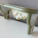 Etajera pictata manual cu margarete, patina verde pastel si dungi aurii subtile. Cu o estetică ce amintește de perioadele clasice, aduce eleganța în contemporan. Formele rafinate și culorile sofisticate creează un cadru deosebit în orice încăpere. Auriul adaugă strălucire, iar patina fină oferă o senzație de autenticitate.