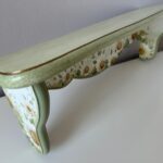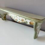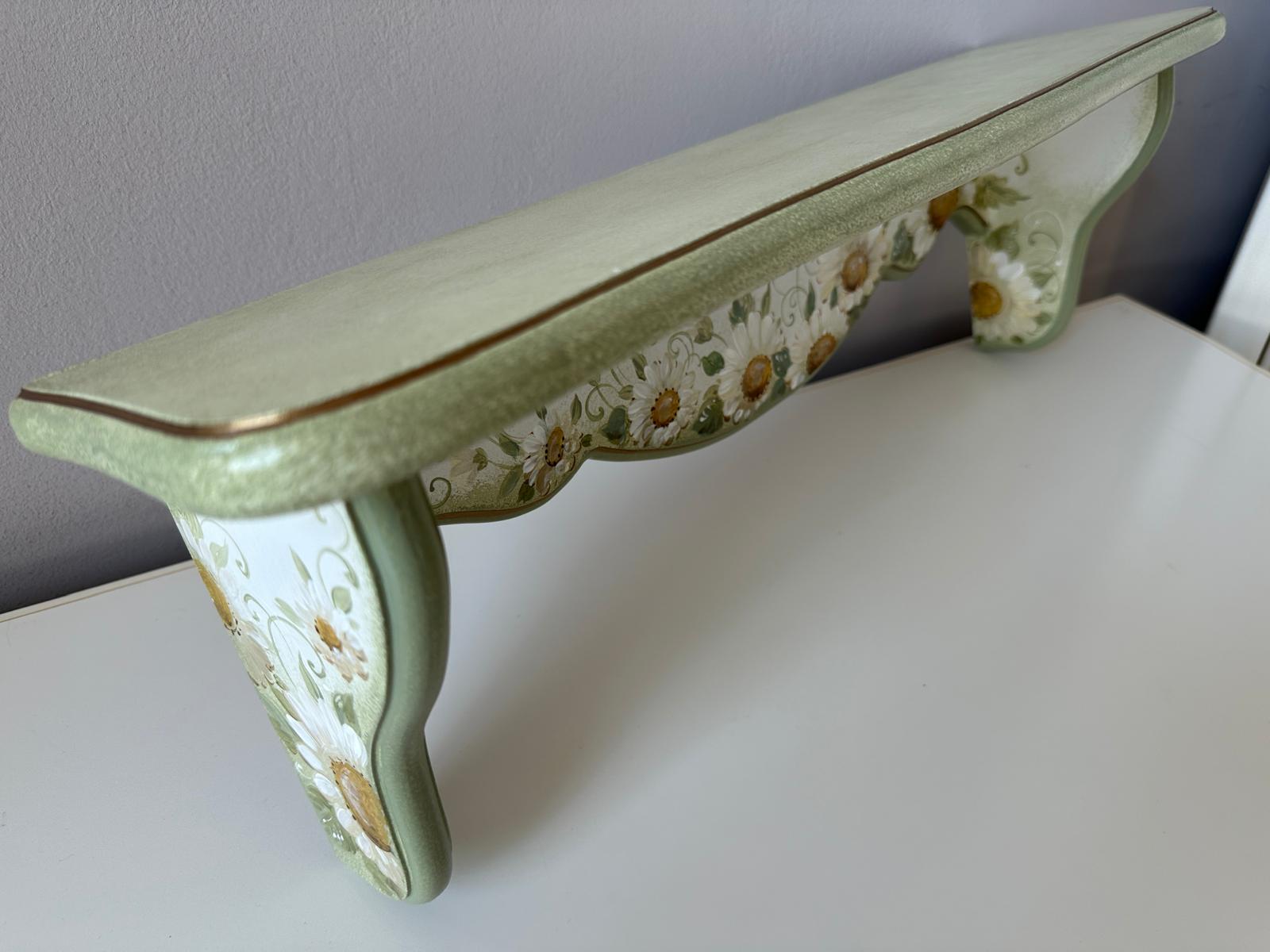 Etajera pictata manual cu margarete si cu dungi aurii. Cu o estetică ce amintește de perioadele clasice, aduce eleganța în contemporan. Formele rafinate și culorile sofisticate creează un cadru deosebit în orice încăpere. Auriul adaugă strălucire, iar patina oferă o senzație de autenticitate.