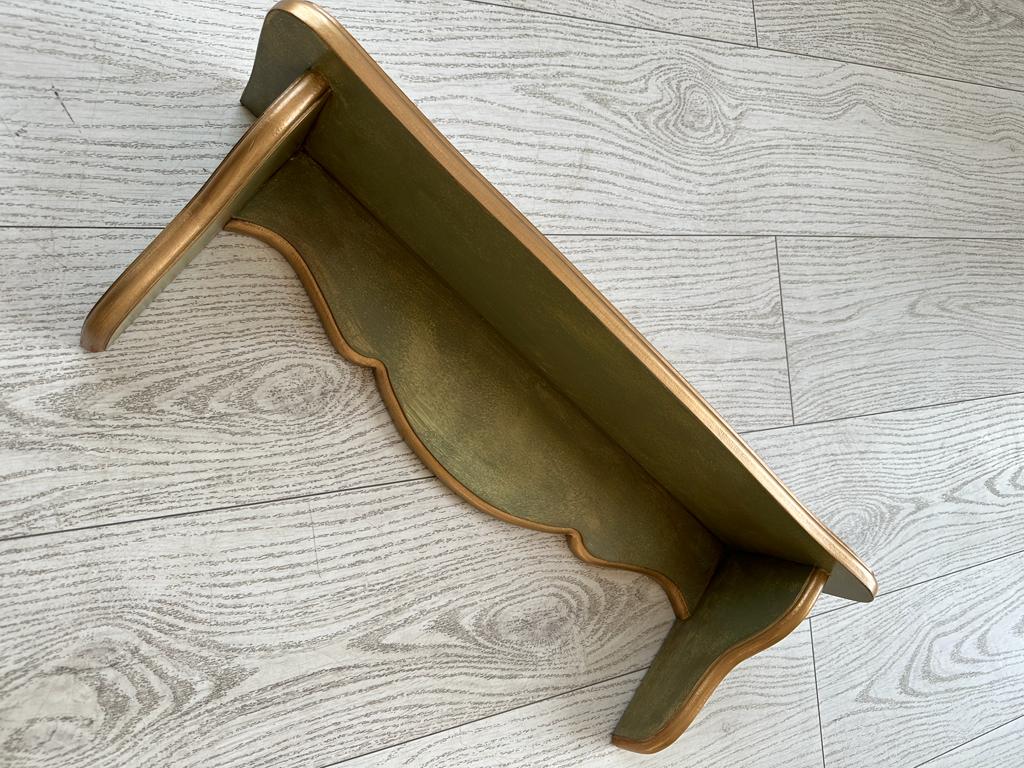 Etajera pictata manual in nuante de verde inchis, patinată si cu dungi aurii. Cu o estetică ce amintește de perioadele clasice, aduce eleganța în contemporan. Formele rafinate și culorile sofisticate creează un cadru deosebit în orice încăpere. Auriul adaugă strălucire, iar patina fină oferă o senzație de autenticitate.