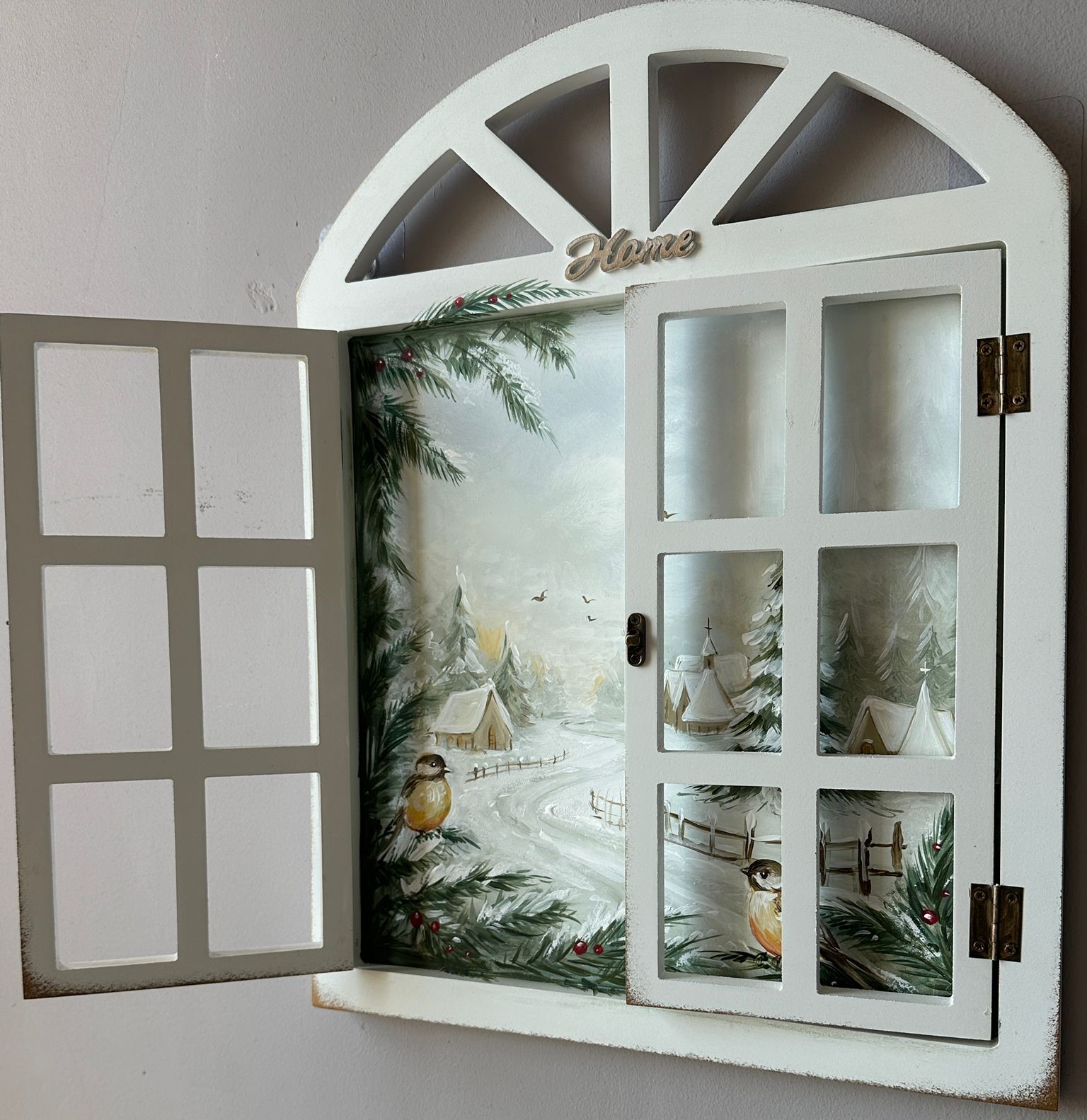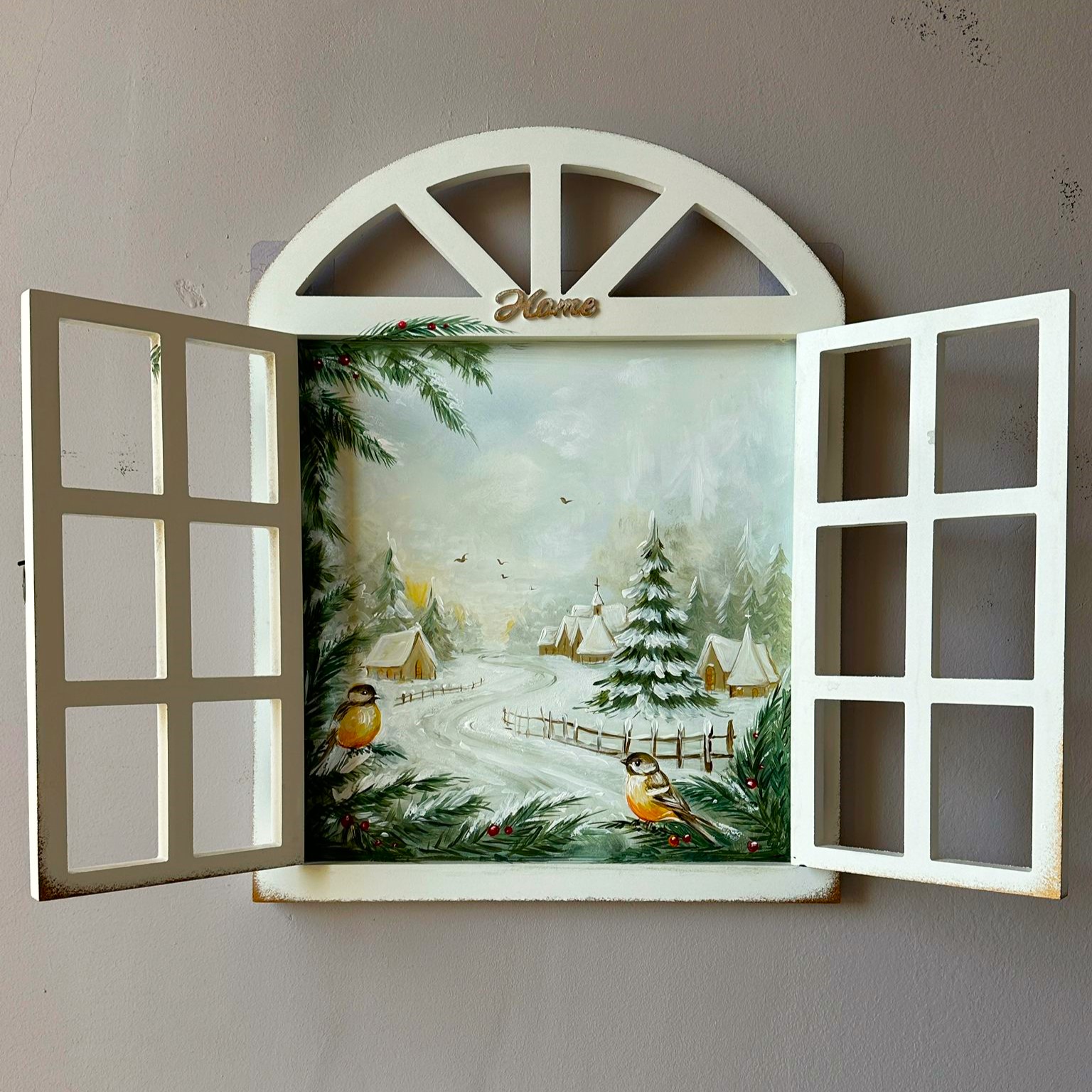 Fereastra de lemn pictata manual cu peisaj de craciun. Realizata din lemn ,prevazuta cu doua usite cu balamale ce se deschid. Pictata manual cu peisaj in nuante de alb, verde si galben reprezentand natura. Dimensiune : cu usile deschise 52cm inaltime, latime 70cm, grosime 1,5cm: cu usile inchise: 52-40cm. Produs Suba Decor realizat cu pictura manuala. Un obiect deosebit cu diferite intrebuintari. Poate fi un cadou potrivit!