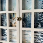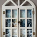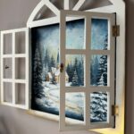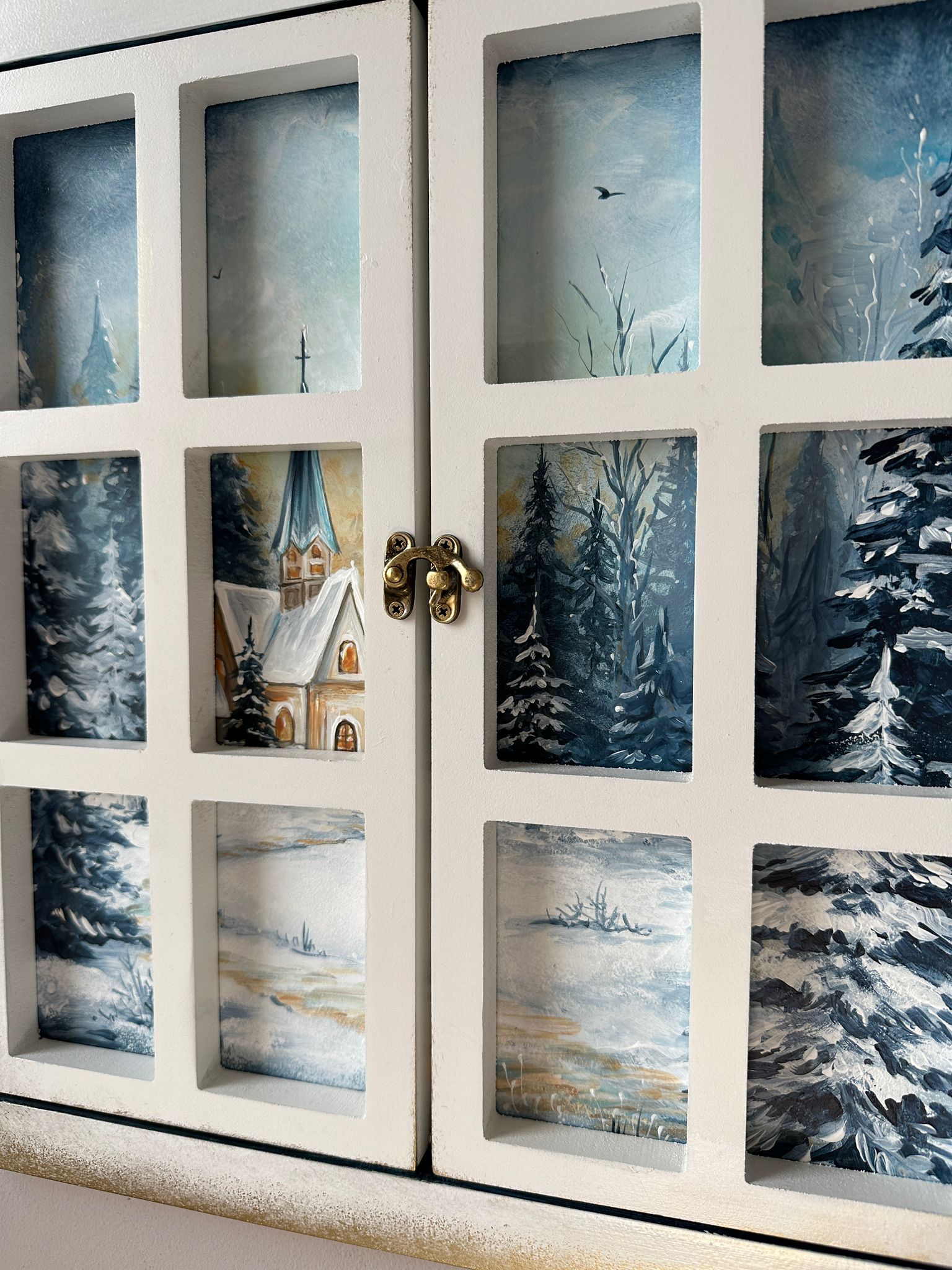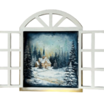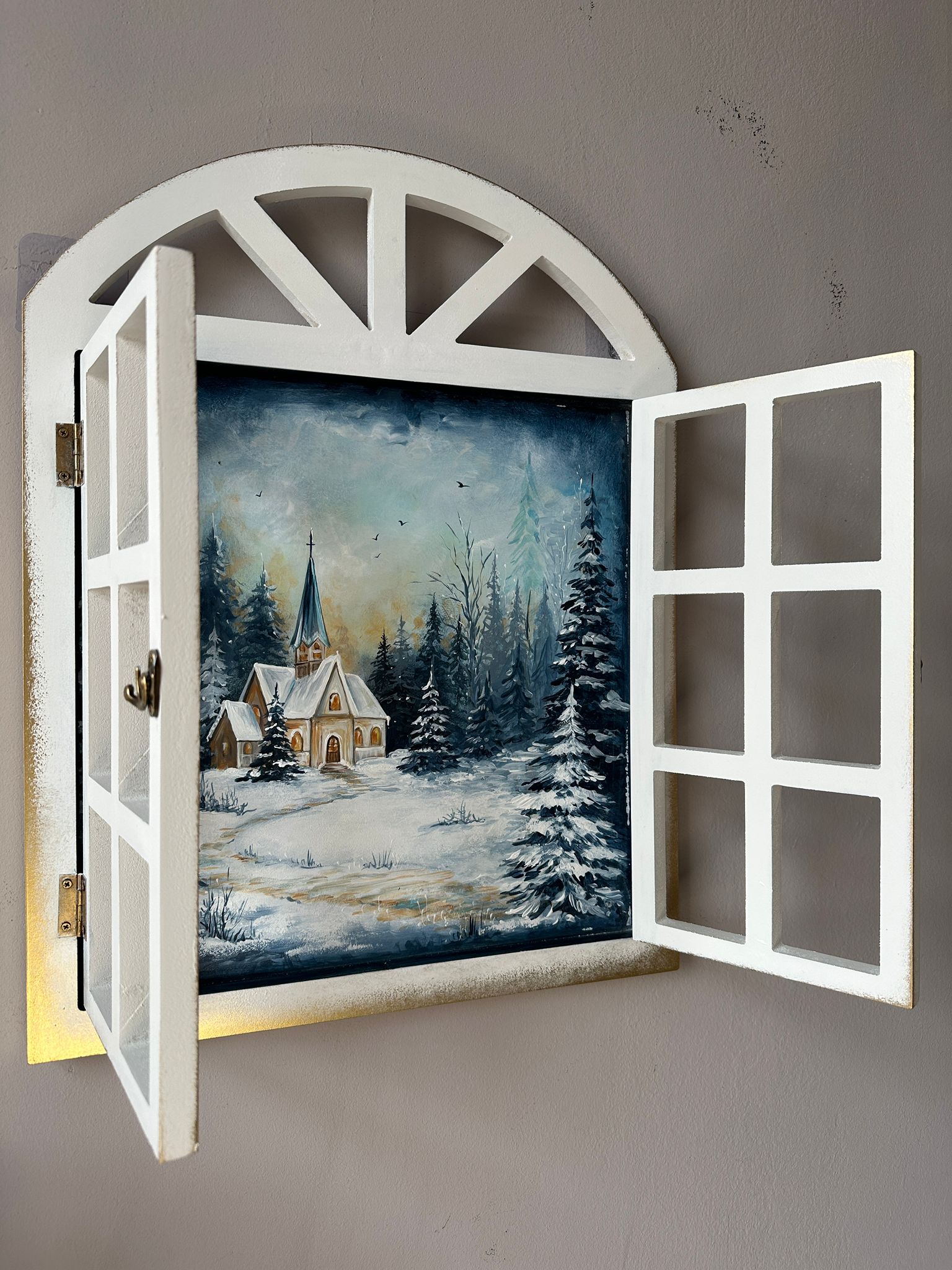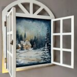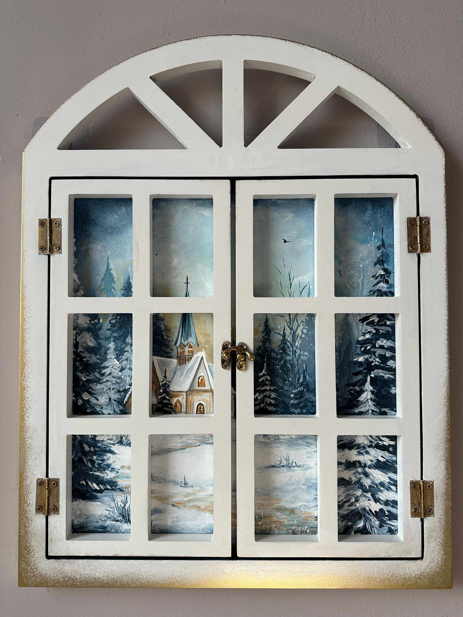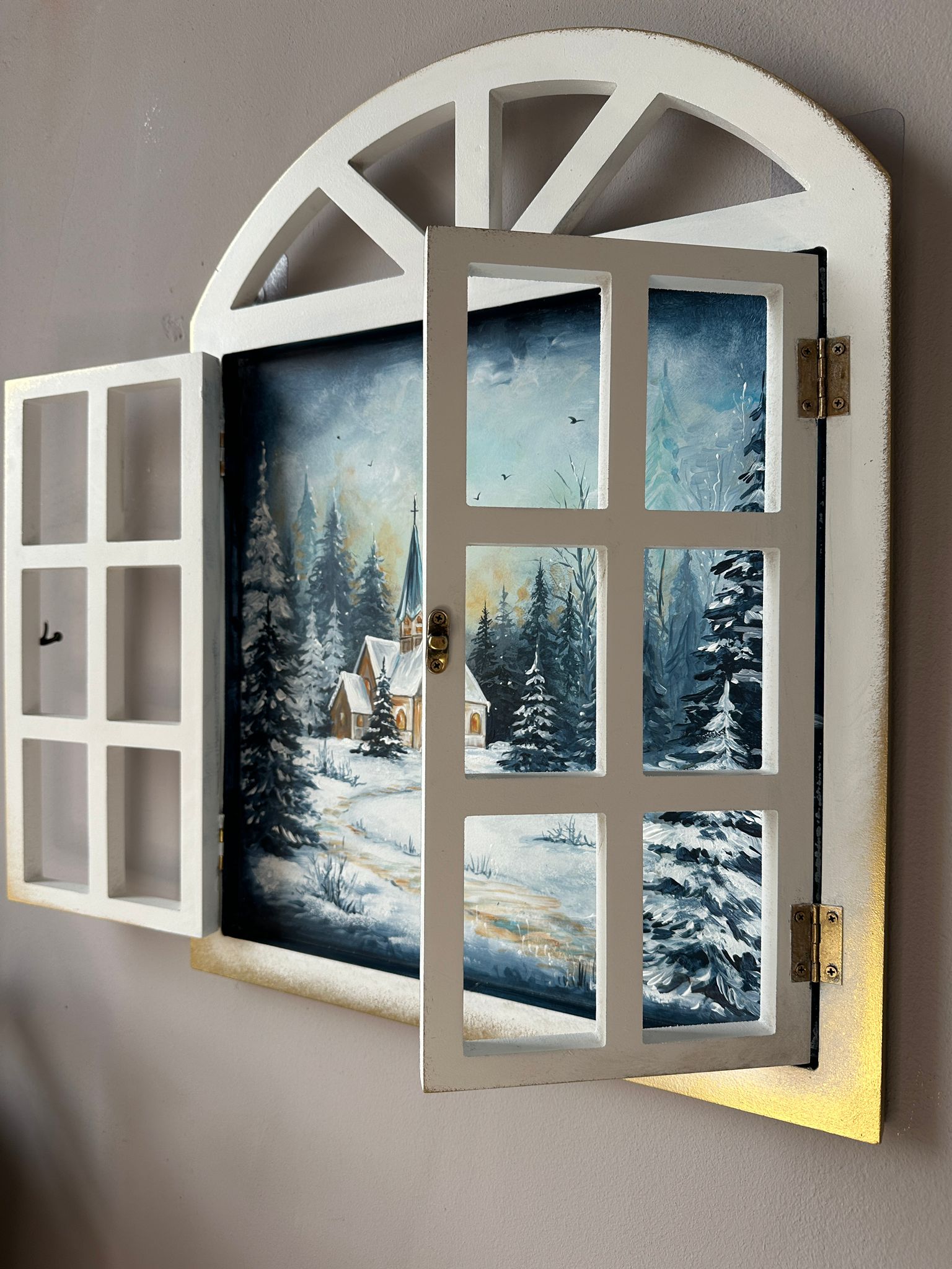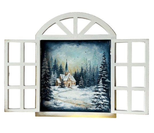 Fereastra de lemn pictata manual cu peisaj de iarna