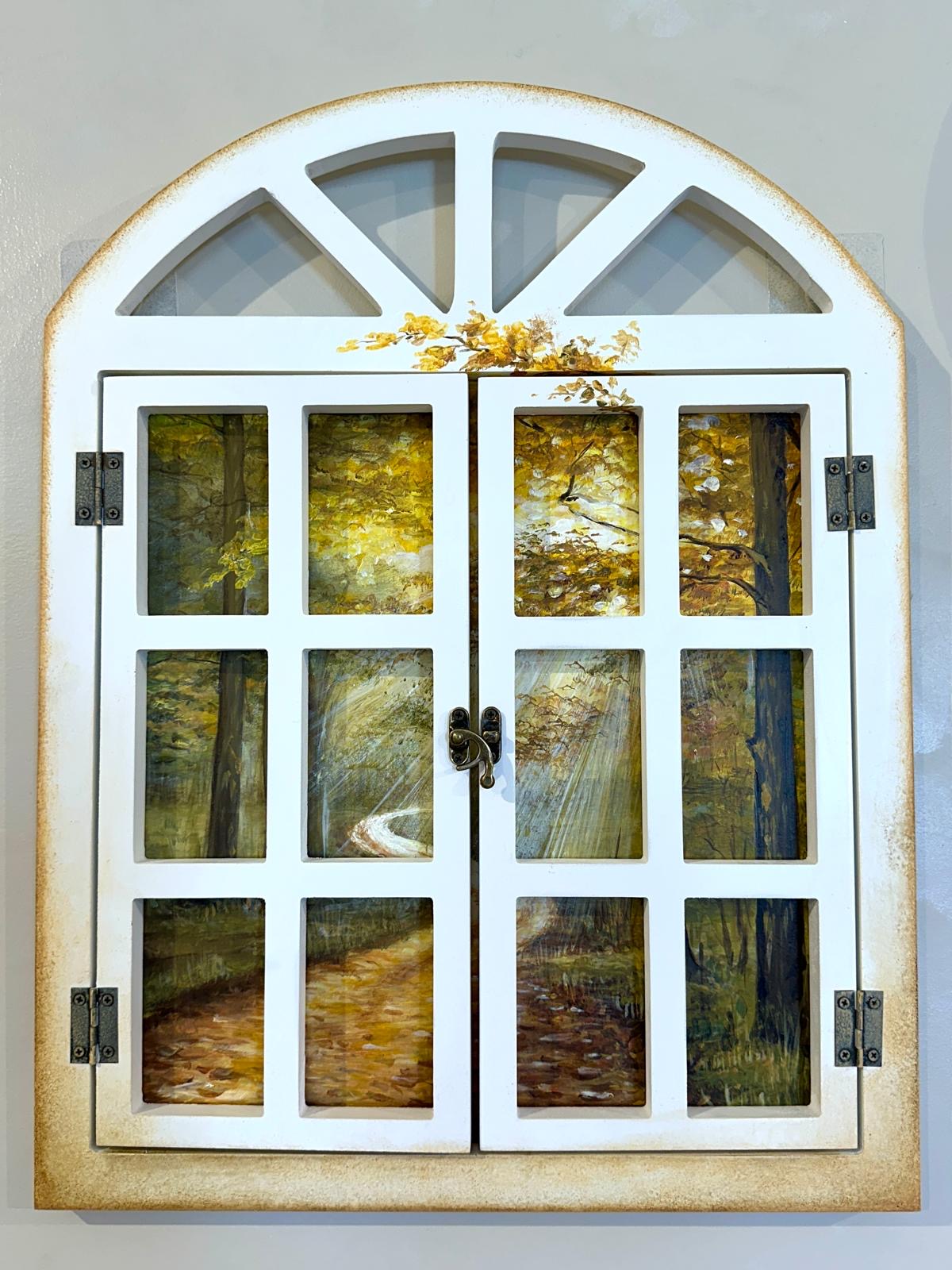 Fereastra de lemn pictata manual cu peisaj de toamna. Realizata din lemn ,prevazuta cu doua usite cu balamale ce se deschid. Pictata manual cu peisaj in nuante de portocaliu, maro, verde si galben reprezentand natura. Dimensiune : cu usile deschise 52cm inaltime, latime 70cm, grosime 1,5cm: cu usile inchise: 52-40cm. Produs Suba Decor realizat cu pictura manuala. Un obiect deosebit cu diferite intrebuintari. Poate fi un cadou potrivit!