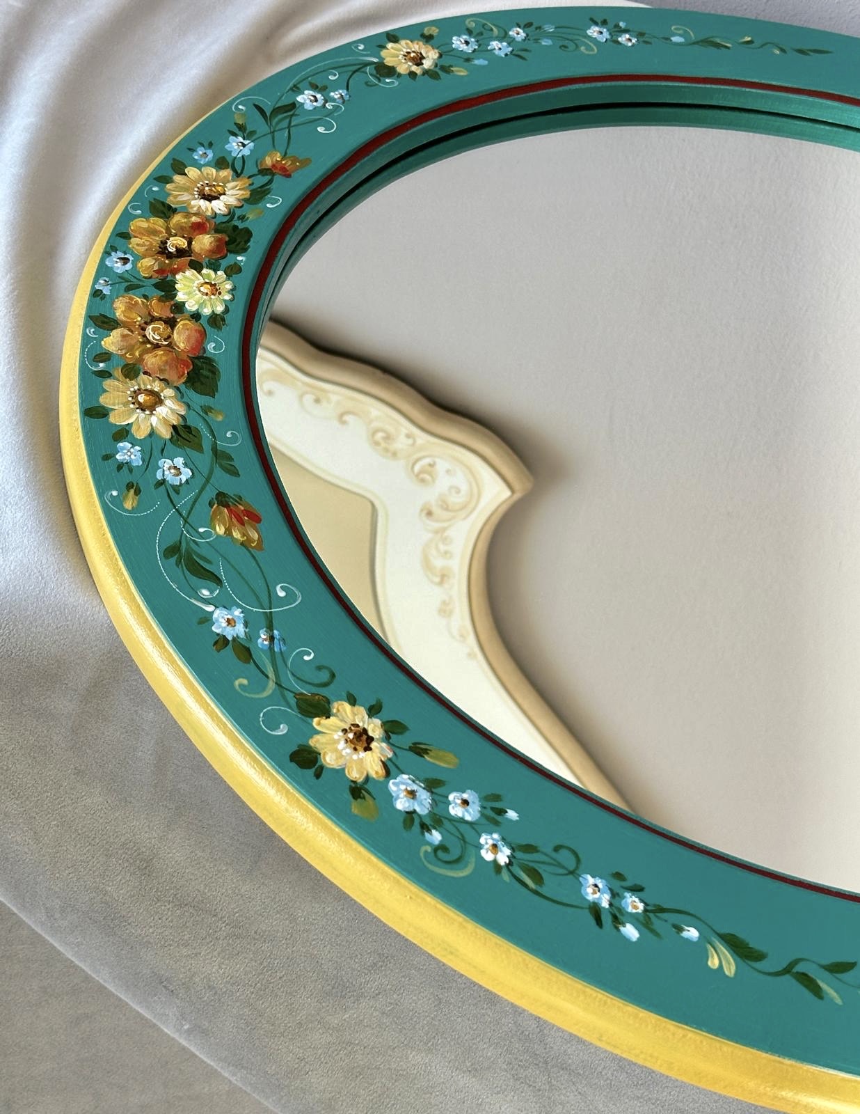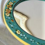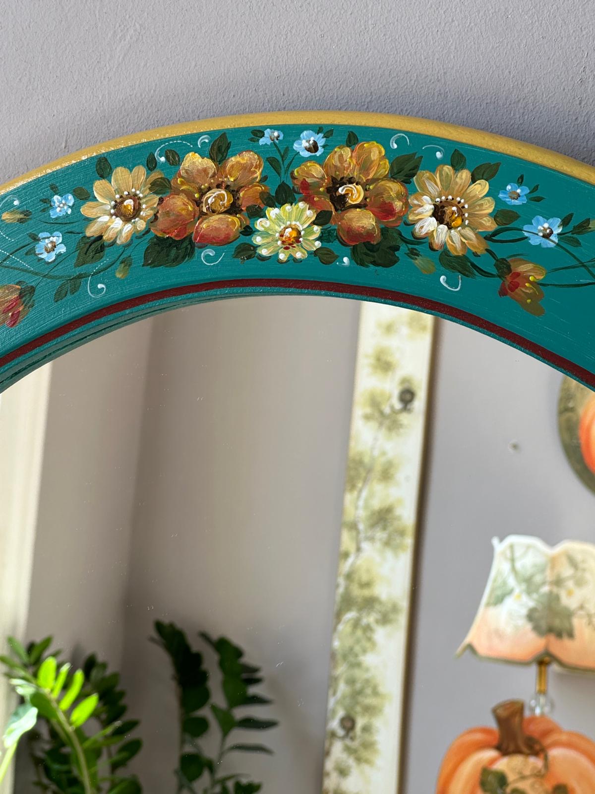 Oglinda de lemn pictata cu flori, realizată în atelierul Suba Decor. Acest obiect decorativ se remarcă prin eleganța sa, având o tematică cu flori. Nuanțele folosite sunt armonioase și versatile. Potrivindu-se perfect într-o varietate de încăperi, fie că este vorba despre baie, dormitor, hol sau bucătărie.