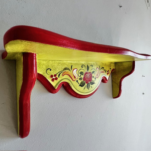 Etajera, care aduce un plus de utilitate. Decorata cu dungi rosii si patina verde, este spațiul pentru depozitare ideal pentru obiecte de uz zilnic. Dimensiunile sunt de: 60x15x22cm. Se poate agăța pe perete cu ajutorul sistemului de prindere.