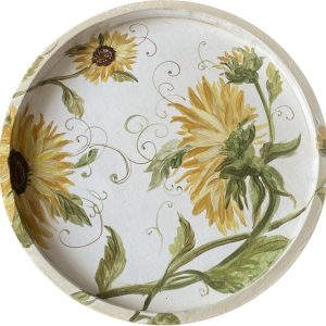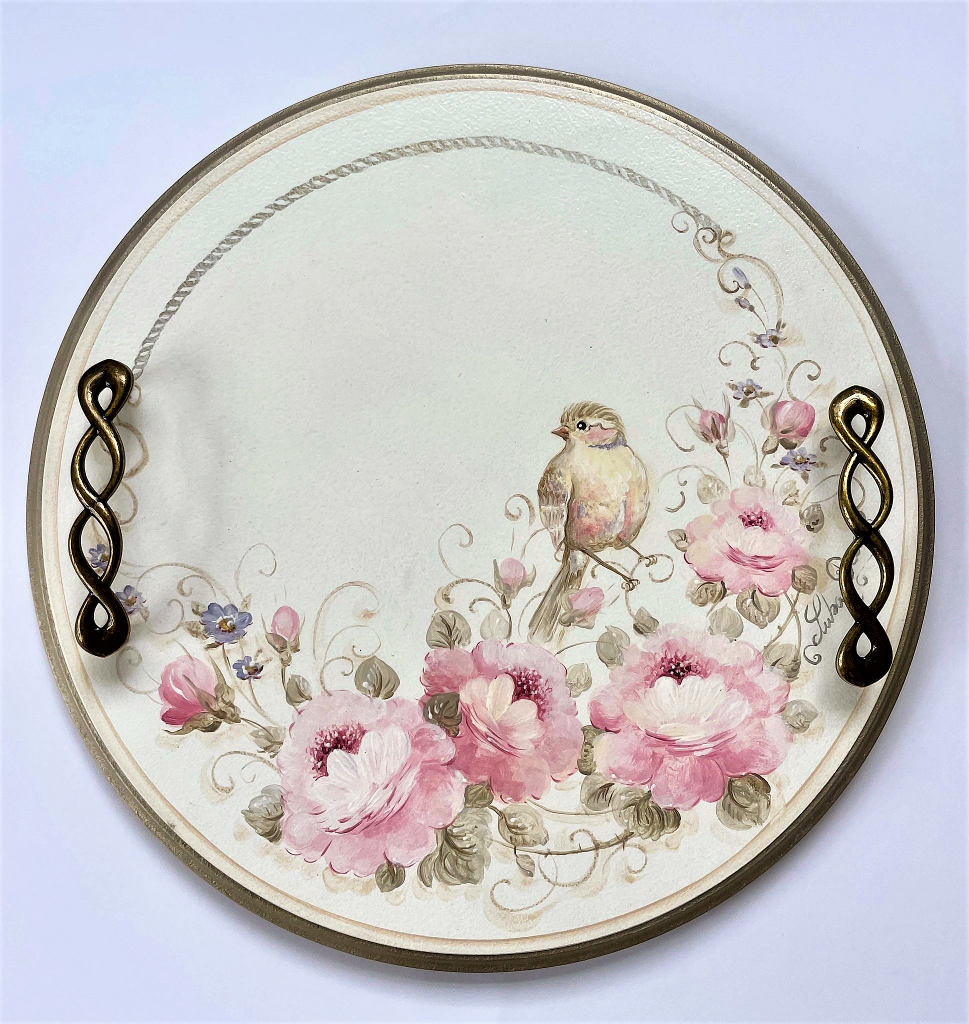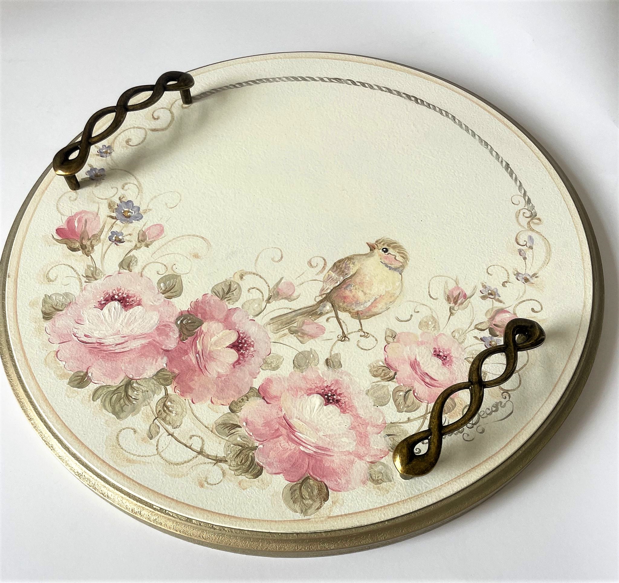 Tava servire din lemn, pictat si patinat manual cu trandafiri in nuante pastelate, detalii cu auriu antichizat. Dimensiunea de 35cm diametru. Cu modele de trandafiri si pasarele, poate fi un cadou elegant, ideal pentru o persoana draga. Piesa realizata in atelierul Suba Decor.