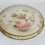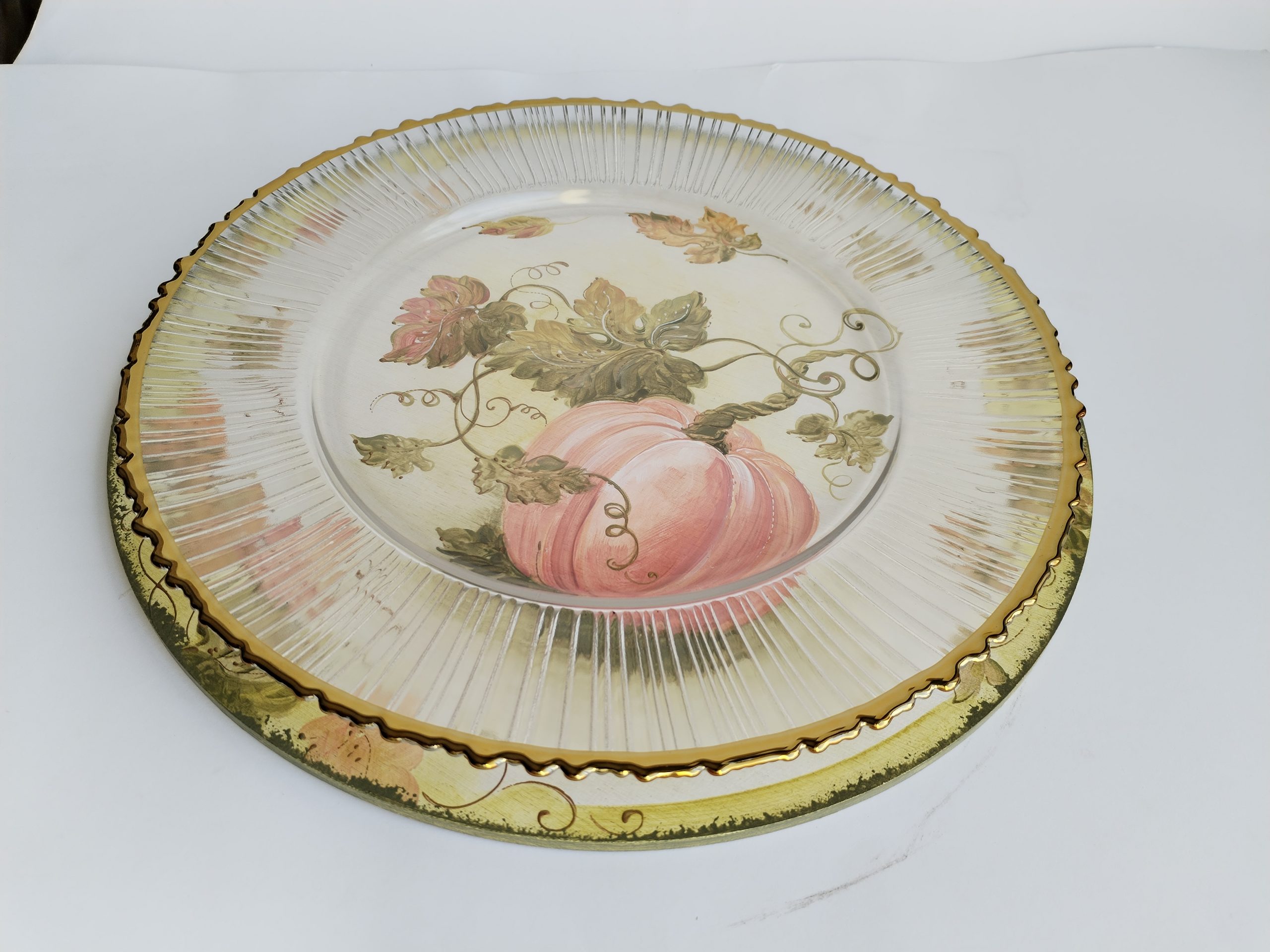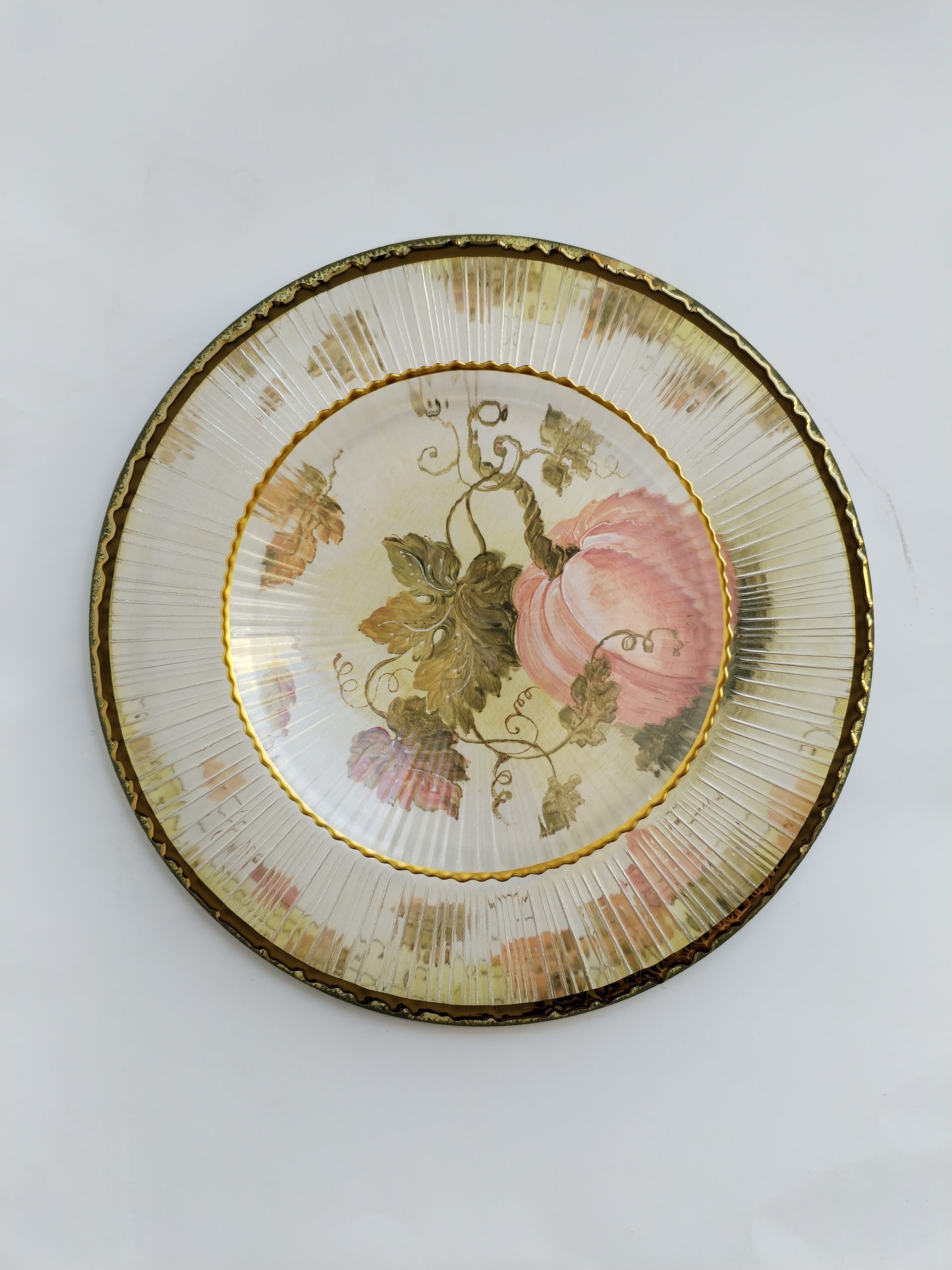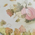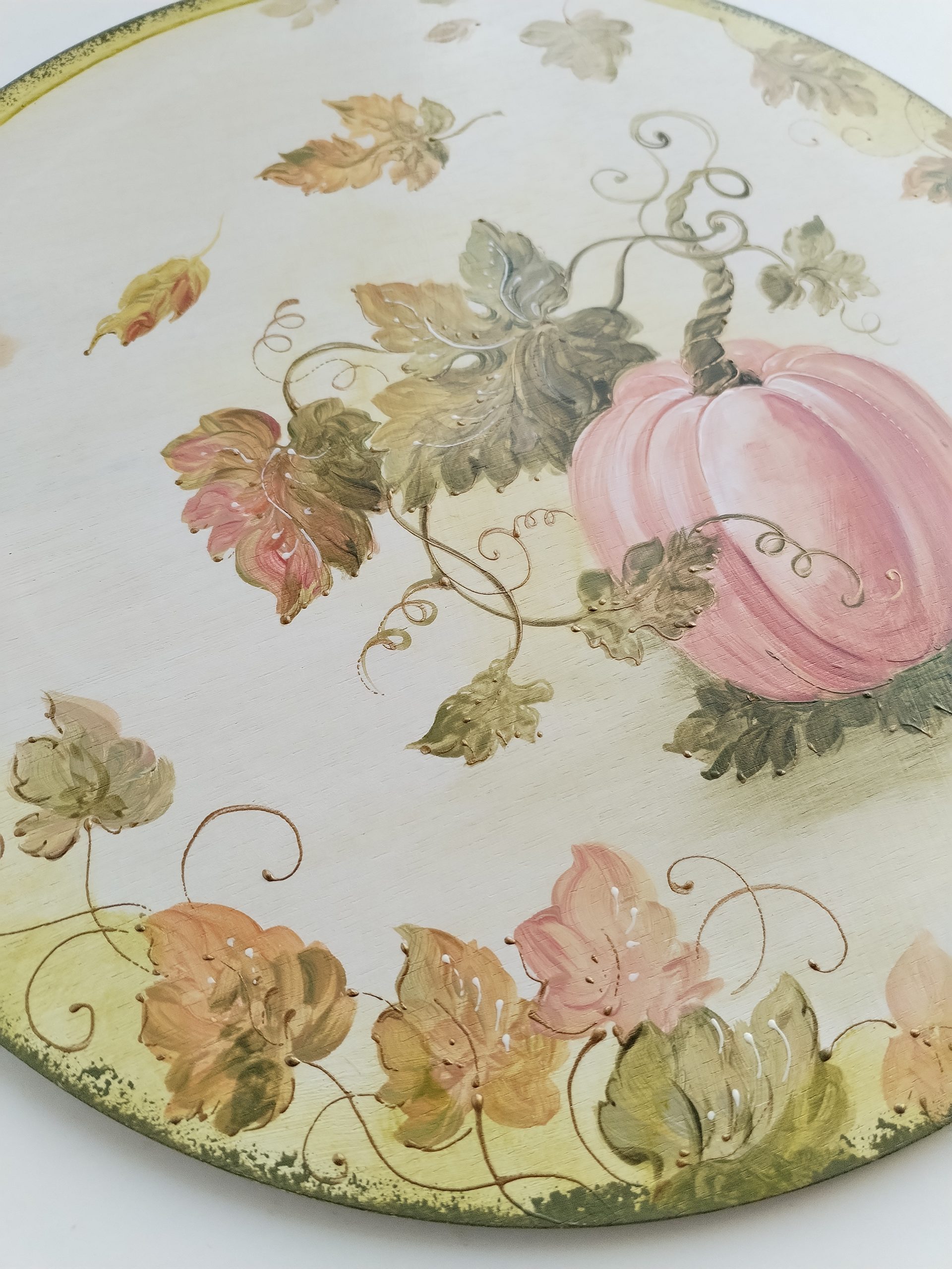 Platou rotund din lemn, pictat manual cu dovlecei decorativi. Ideal pentru servit masa, ca suport pentru farfurie. Alaturi de o farfurie din sticla transparenta, are un aspect minunat.