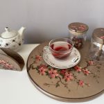 Platou servire din lemn, pictat manual cu flori de cires. Ideal pentru servit masa, ca suport pentru farfurie, tava pentru cafea, ceai sau desert, sau ca si decoratiune. Alaturi de o farfurie din sticla transparenta, are un aspect minunat.