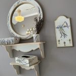 Două etajere, care aduc un plus de utilitate în baie. Fiecare etajeră are contururi decorate cu patina bej si dungi argintii, și este spațiu de depozitare ideal pentru obiecte de uz zilnic. Dimensiunile acestora sunt de: 40x15x21cm – poliță mica, și 60x15x22cm – poliță mare. Se poate agăța pe perete cu ajutorul sistemului de prindere.