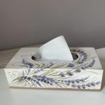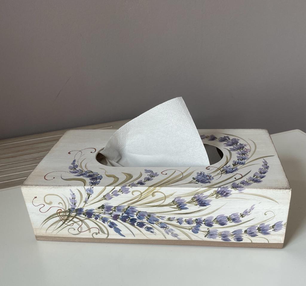 Cutie pentru servetele, pictata si decorata cu dungi argintii, care completeaza setul. Are dimensiunile de 25 x 13 x 8 cm.