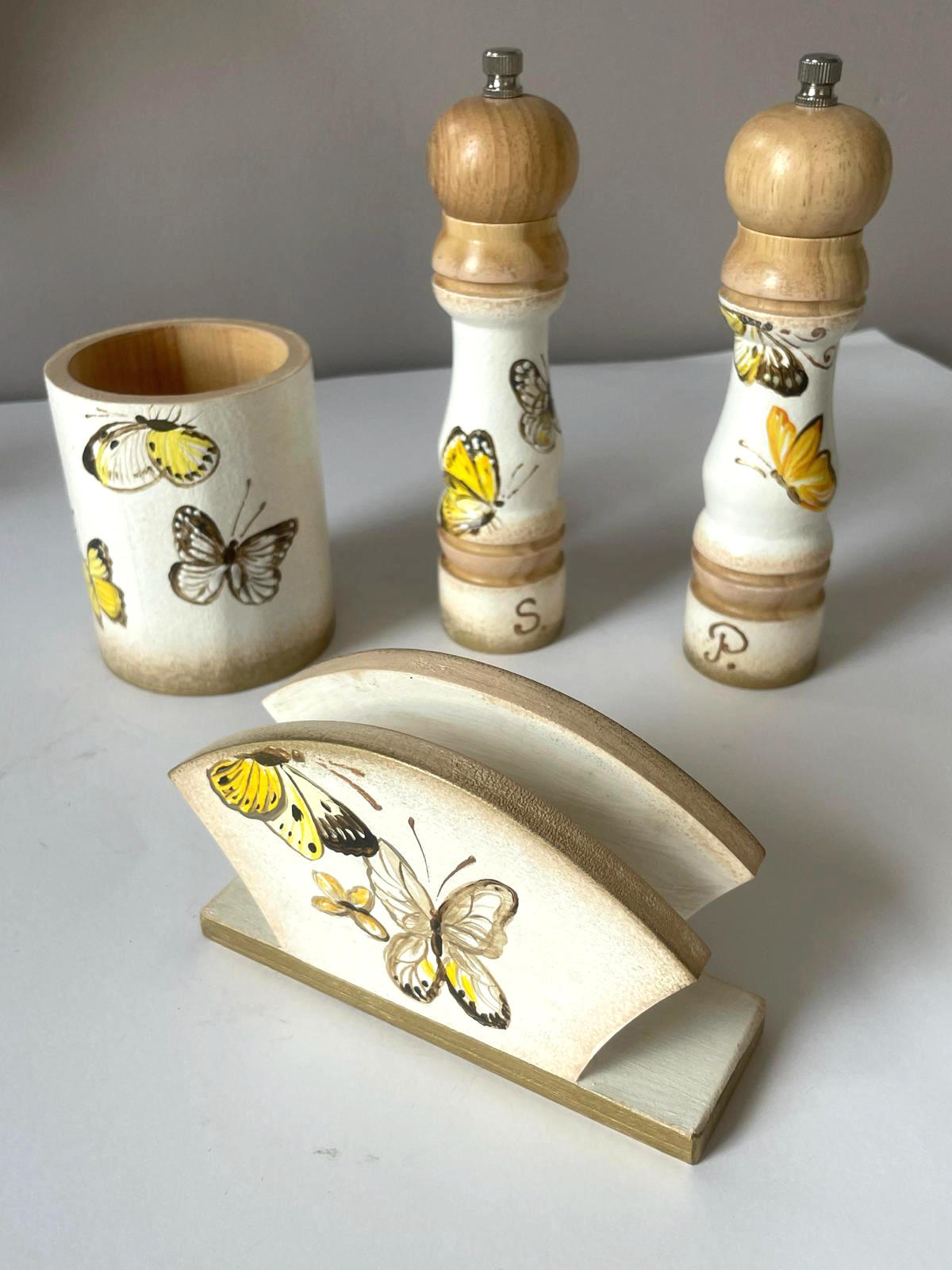 Set de bucatarie realizat din lemn și pictat manual cu fluturi galbeni, în atelierul Suba Decor. Pictati pe fundal alb, usor patinat cu o nuanta deschisa de bej, cu accente aurii.