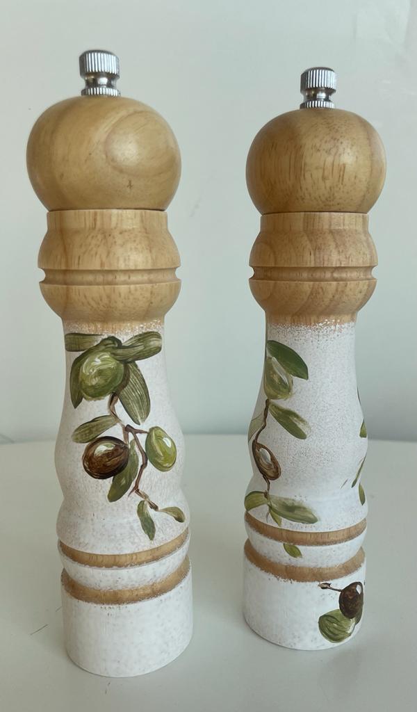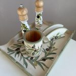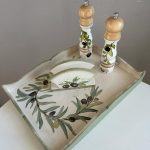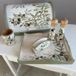 Set de bucatarie realizat din lemn și pictat manual cu masline, în atelierul Suba Decor. Cu nuante de verde pastel, alb si negru.