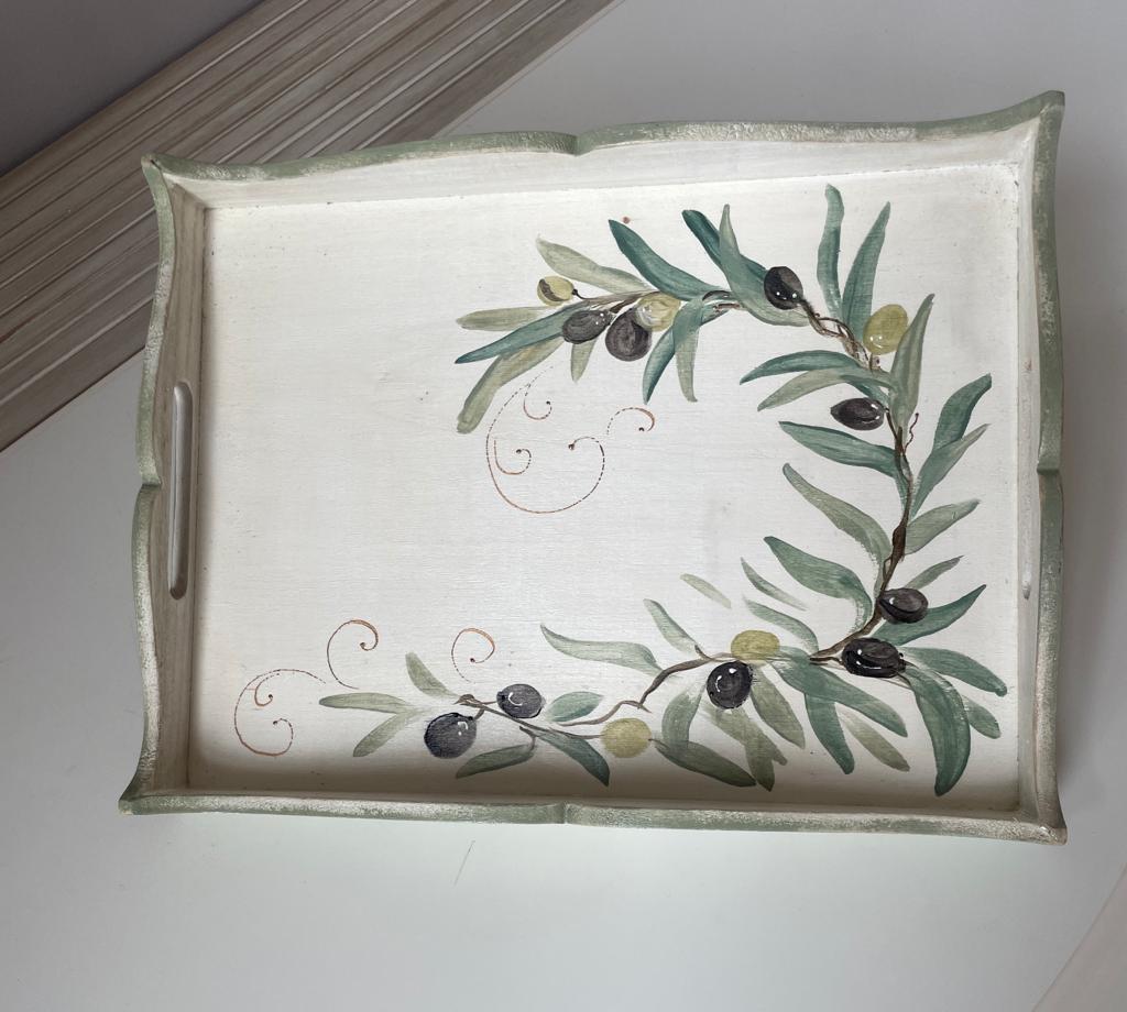 Tava rotunda, cu mânere metalice, pictată cu masline. Se poate folosi pentru servit cafea, ceai sau desert. Are 35rasnite cm diametru.