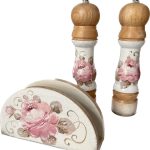 Set de bucatarie realizat din lemn și pictat manual cu trandafiri roz pastel, în atelierul Suba Decor.