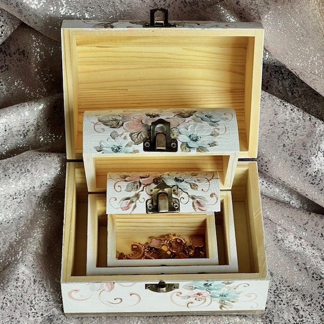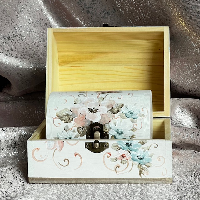 Acest set elegant de 3 cutii pentru bijuterii, tip cufar, este o adevărată operă de artă. PIctate manual cu dragoste și atenție la detalii in atelierul Suba Decor. Fiecare cutie este decorată cu o pictura de flori de câmp în nuanțe delicate de roz și albastru pastelat. Evocând o atmosferă de vis și naturalețe. Dimensiunile cutiilor sunt: cutia mare-16x12x11, cea medie- 12x8x9, cea mica- 9x5x6.