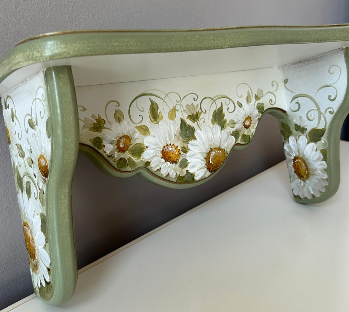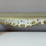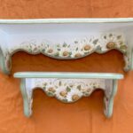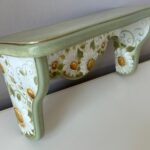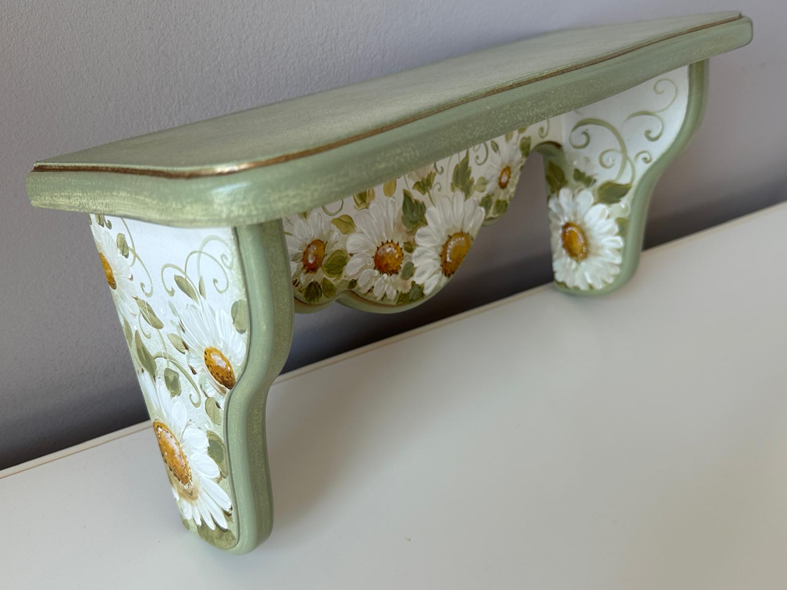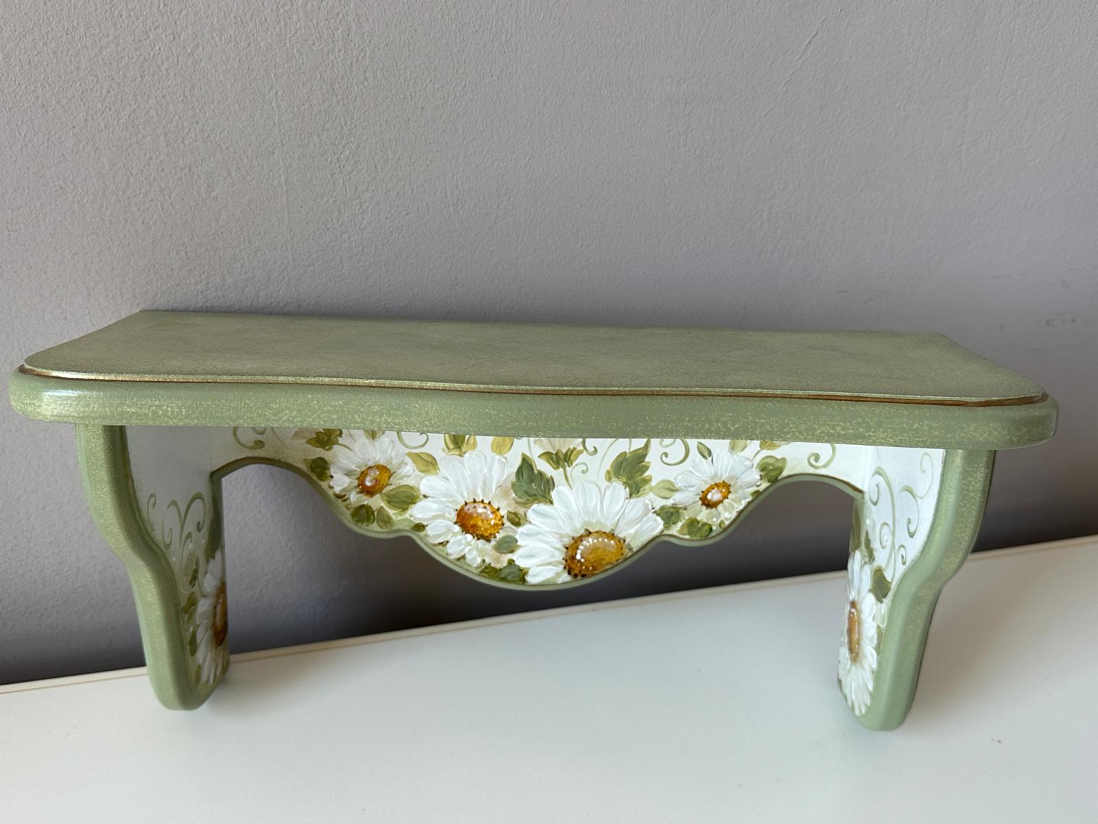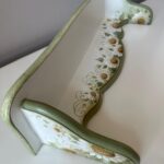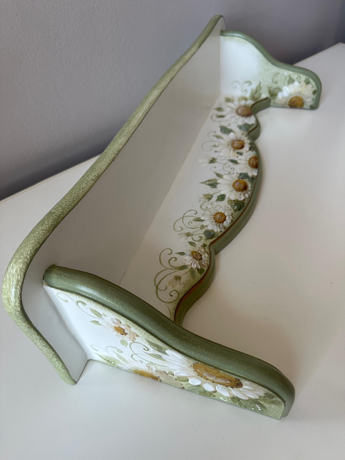 Set de doua etajere cu margarete, verde pastel si cu dungi aurii. Cu o estetică ce amintește de perioadele clasice, acest set de două etajere aduce eleganța în contemporan. Formele rafinate și culorile sofisticate creează un cadru deosebit în orice încăpere. Auriul adaugă strălucire, iar patina fină oferă o senzație de autenticitate.