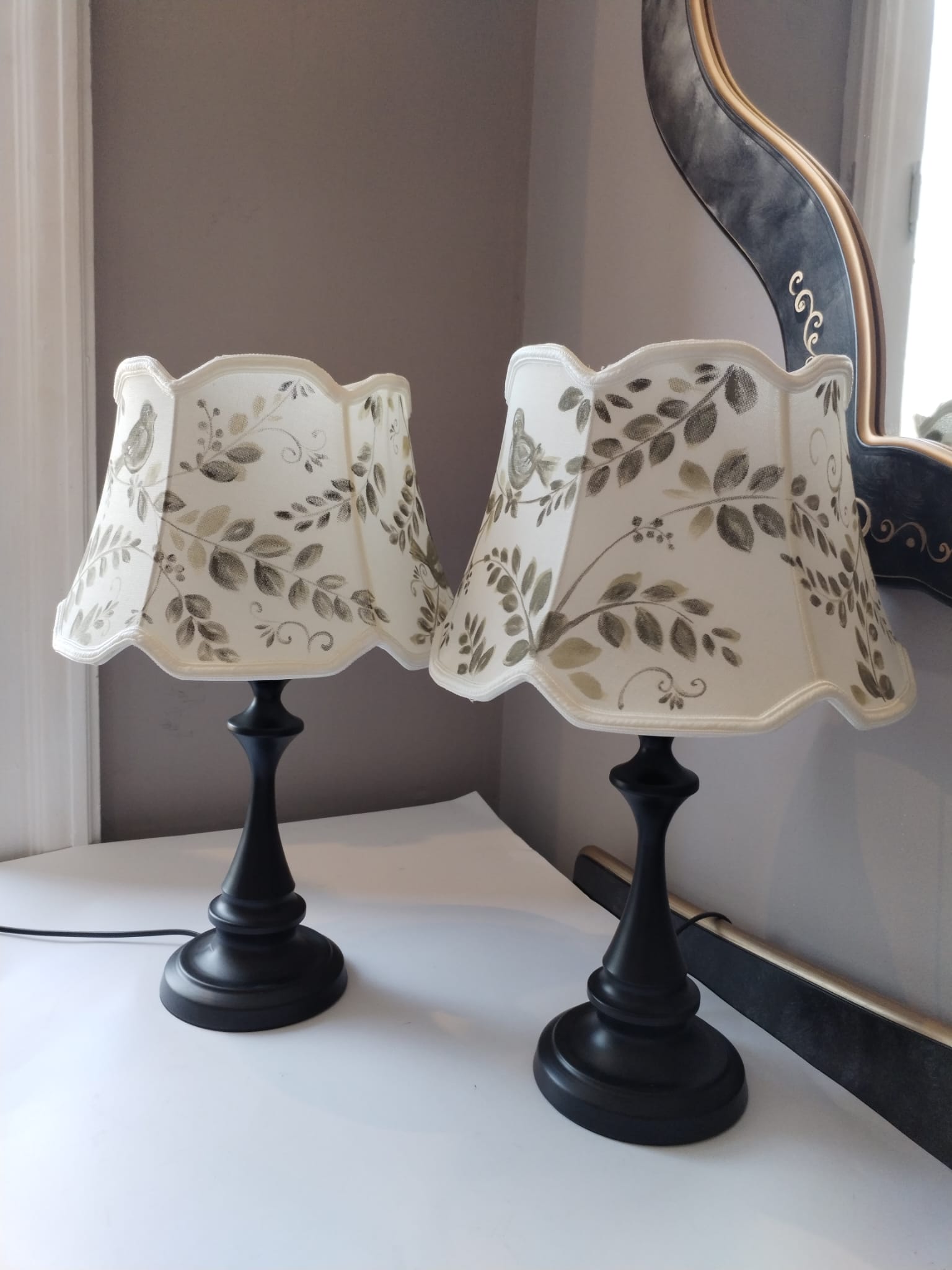 Set de doua veioze cu picior metalic, cu abajur pictat manual cu pasari pe crengute, in nuante de verde inchis. Foarte decorative si utile, aduc un aspect elegant in dormitorul dvs. Au inaltimea de 50 cm.