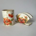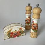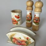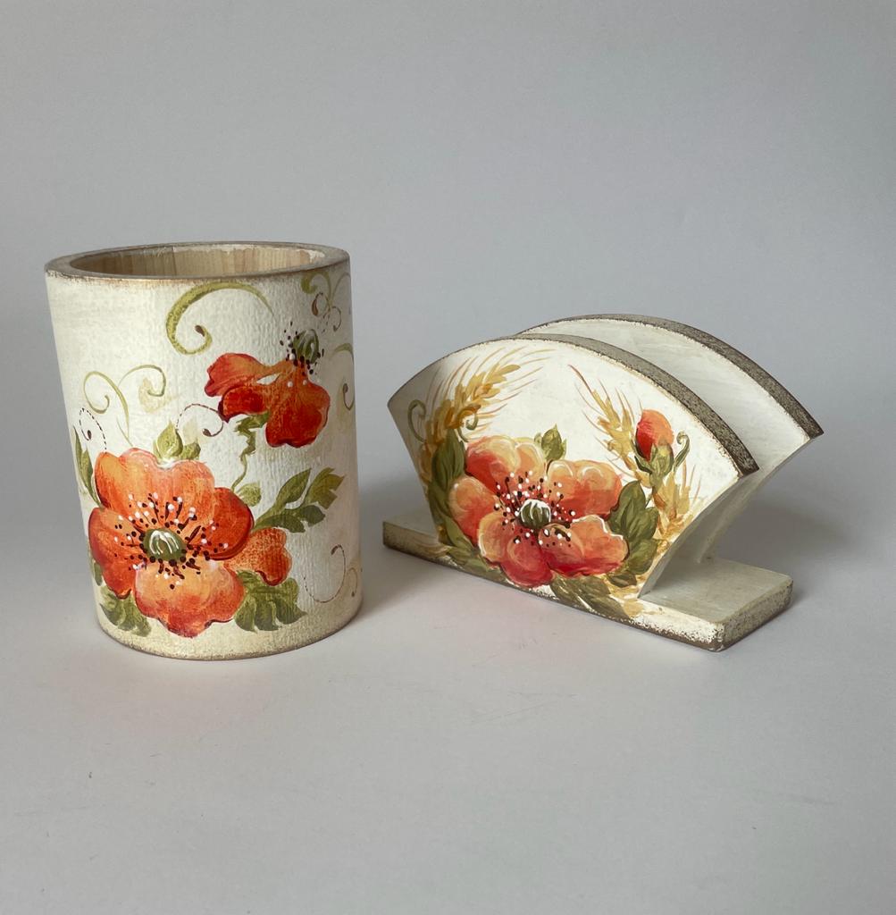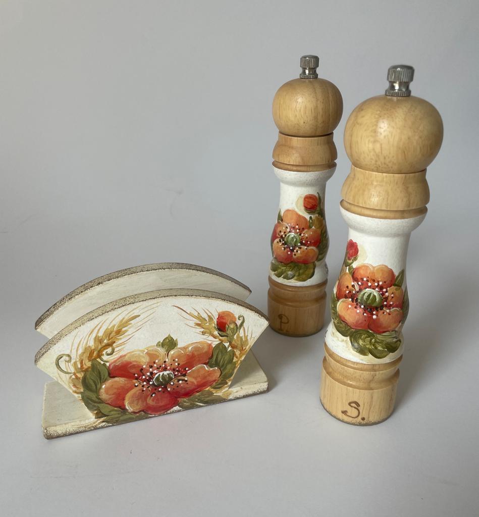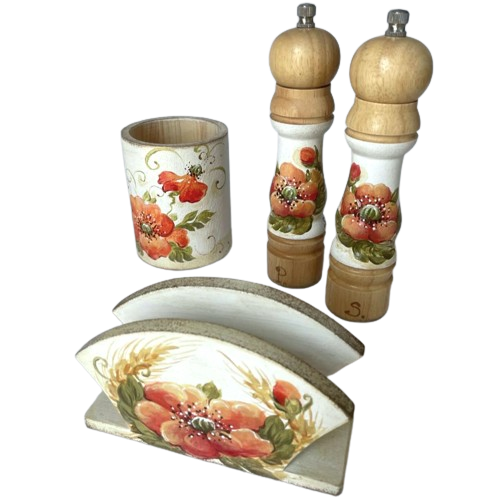 Set format din doua rasnite, un suport de servetele si un pahar din lemn, pictate si patinate manual, cu flori de mac. Produsele sunt pictate in atelierul Suba Decor. Dimensiuni: rasnite 18,5cm-4cm, suport servetele 13-7,7-4cm, pahar lemn 10cm-8cm.