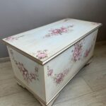 Lada depozitare din lemn cu trandafiri, patină și dungi aurii.