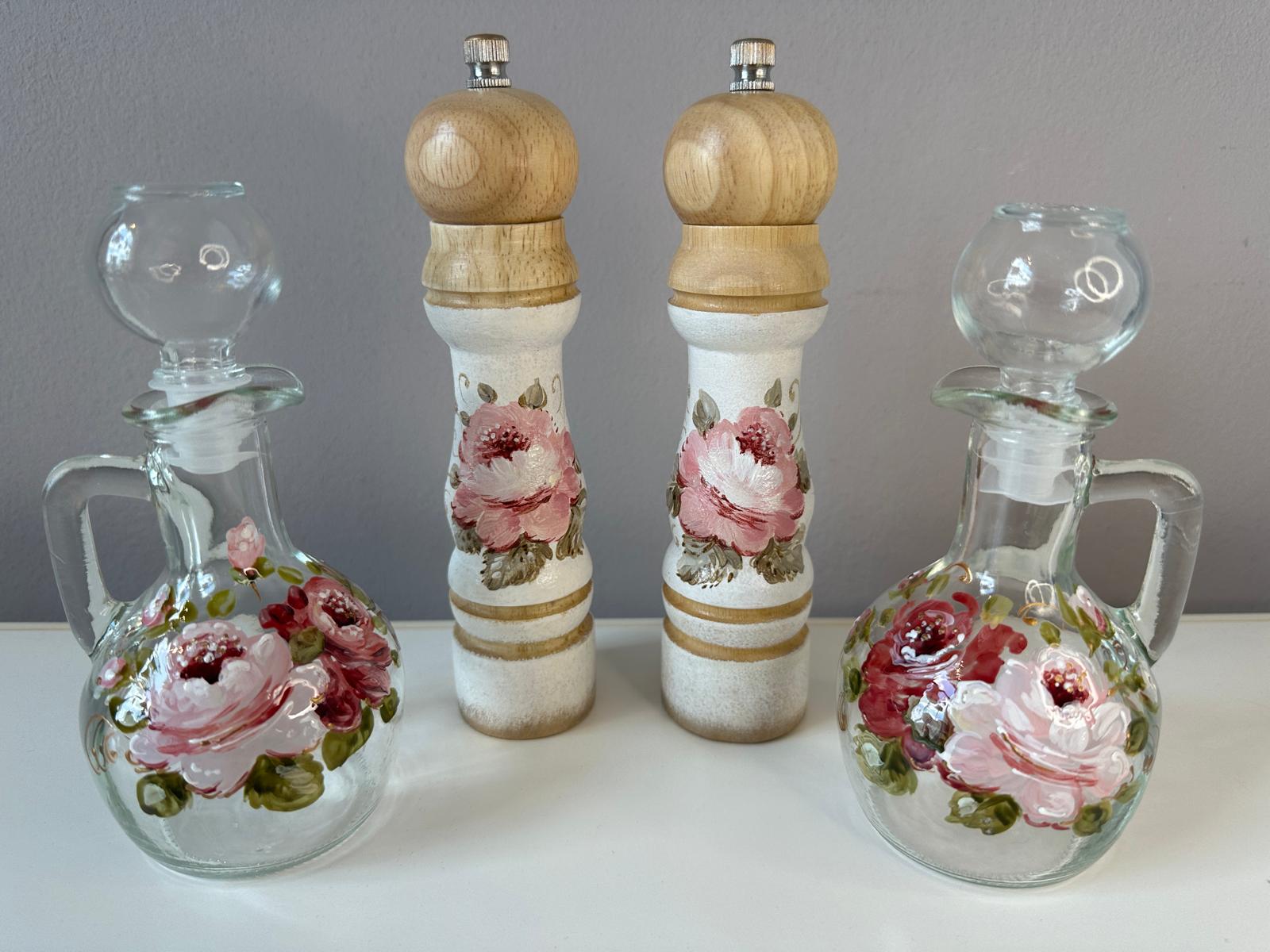 Set pentru condimente de masa pictat manual cu trandafiri. Acest set de condimente pentru masă, decorat manual cu flori, adaugă eleganță oricărei mese.