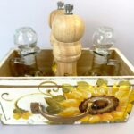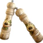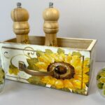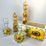 Set pentru condimente de masa pictat manual cu floarea soarelui. Acest set de condimente pentru masă, decorat manual cu floarea soarelui, adaugă eleganță oricărei mese.