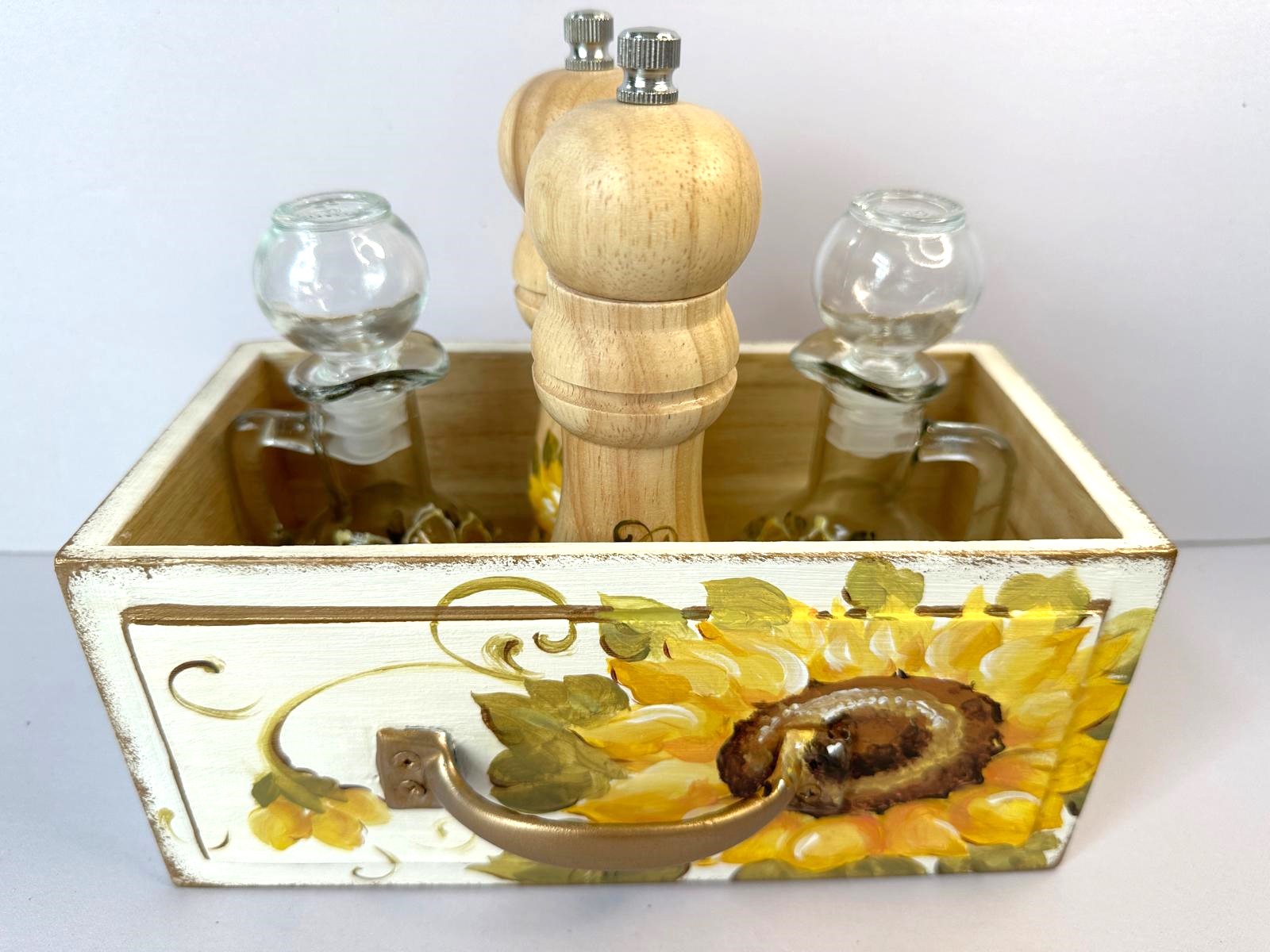 Setul include două râșnițe din lemn, perfecte pentru sare și piper, două sticle elegante pentru ulei și oțet, și un recipient decorativ în formă de sertar, ideal pentru păstrarea condimentelor in mod util si estetic. Se poate aseza pe masa. Sertarul decorativ se poate folosi ca si suport de tacamuri. Fiecare piesă este pictată manual in culori rezistente in timp. Piesele din lemn sunt acoperite cu un strat de lac rezistent. Designul armonios și detaliile fine fac din acest set nu doar un accesoriu practic, ci și un element decorativ atrăgător.