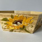 Tava sau cosulet din lemn: O piesa versatila, care se poate folosi ca si cosulet de paine si pentru a organiza piesele setului. Pictat pe toata suprafata exterioara, cu floarea soarelui . Are dimensiunile de 21×7 cm.
