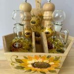 Set pentru organizarea si servirea mesei, pictat manual cu floarea soarelui in stil rustic, care contine urmatoarele: