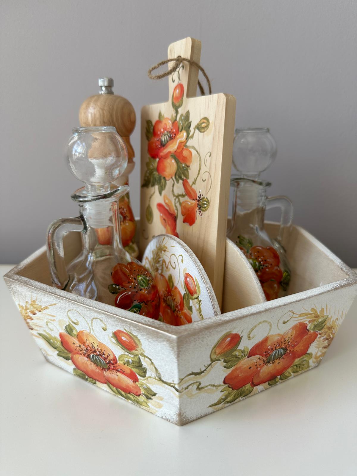 Tava sau cosulet din lemn: O piesa versatila, care se poate folosi ca si cosulet de paine si pentru a organiza piesele setului. Pictat pe toata suprafata exterioara cu maci. Are dimensiunile de 21×7 cm.
