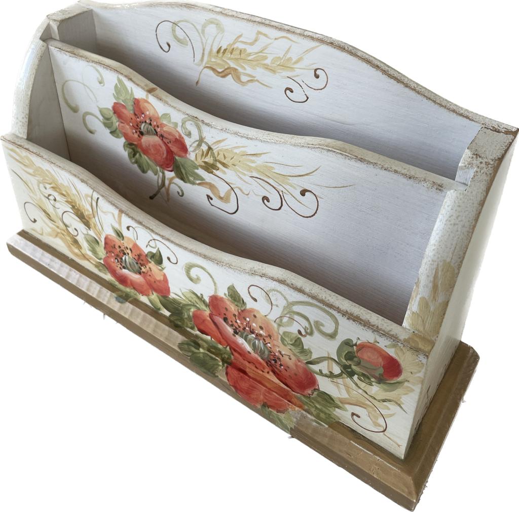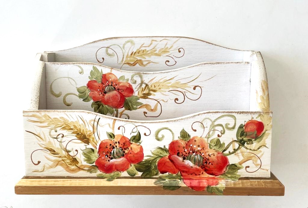 Cutie de lemn pentru aranjament tacâmuri, servetele ,scrisori sau facturi. Aceasta este pictata manual in atelierul Suba Decor. Pictura este realizata cu flori de mac. Dimensiunea suportului este 27cm lungime, 16cm adancime, 8,5cm latime. Decoreaza locul de luat masa cu aceasta decoratiune deosebita.