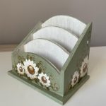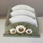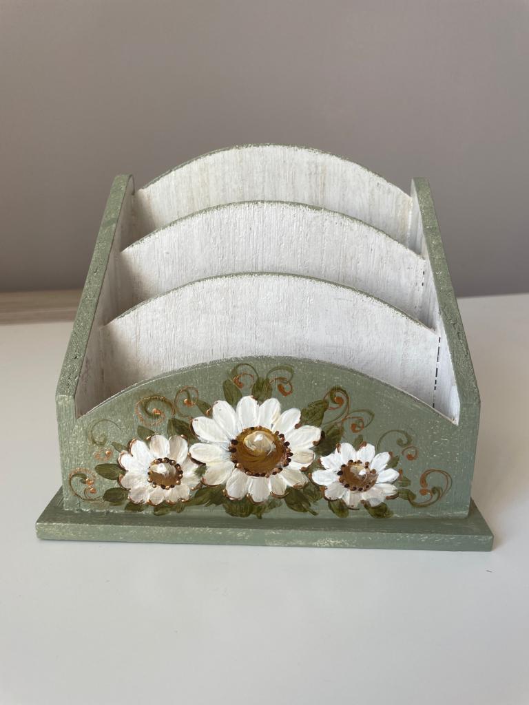 Suport pentru tacamuri si servetele, pictat manual in nuante de alb si verde mint, cu margarete. Ideal de pus in bucatarie pe masa pentru servire. Dimensiunile sunt de 16x11x14cm, si este pictat manual in atelierul Suba Decor.