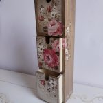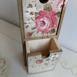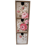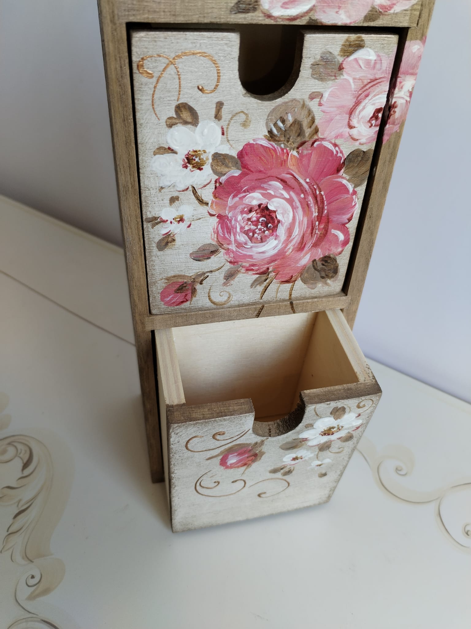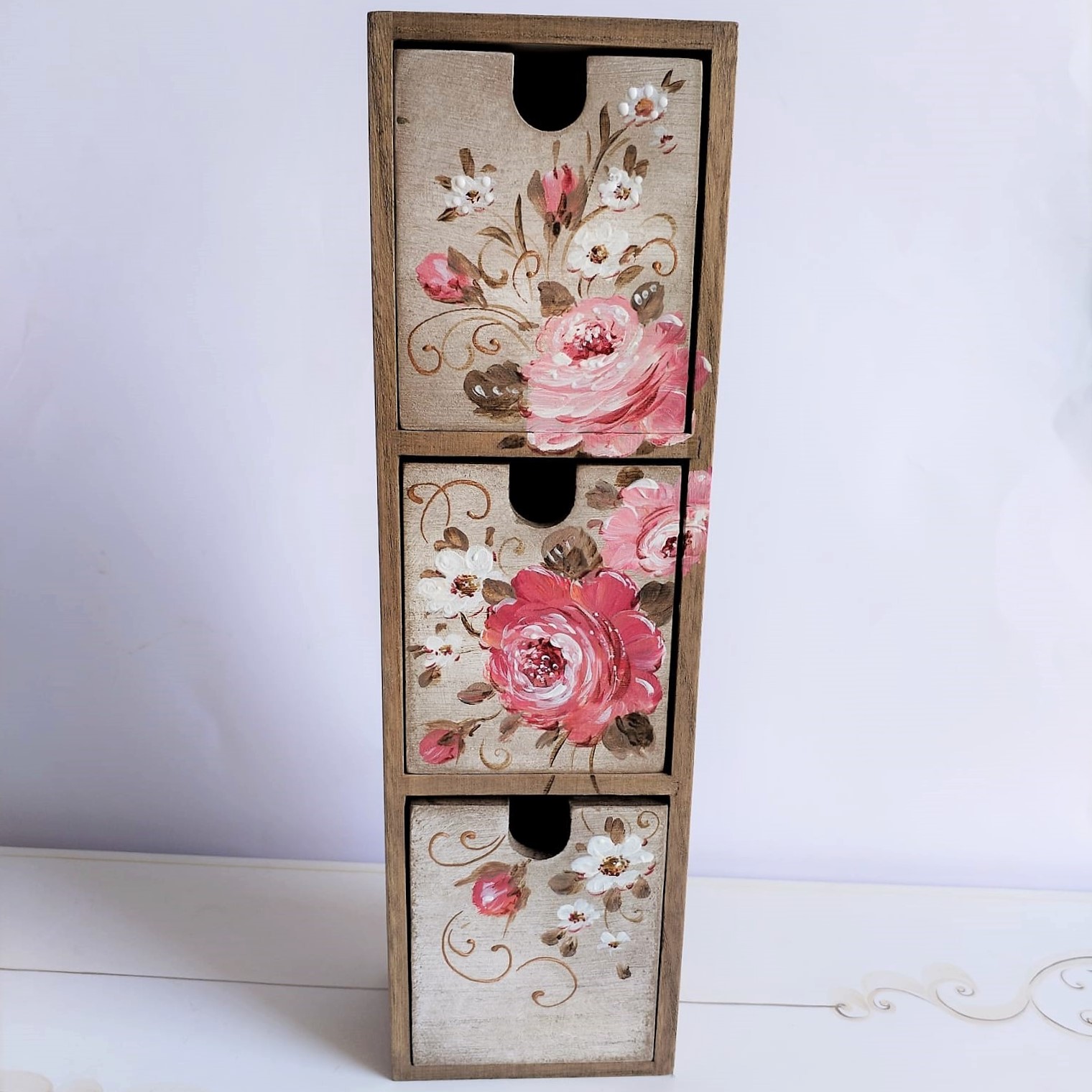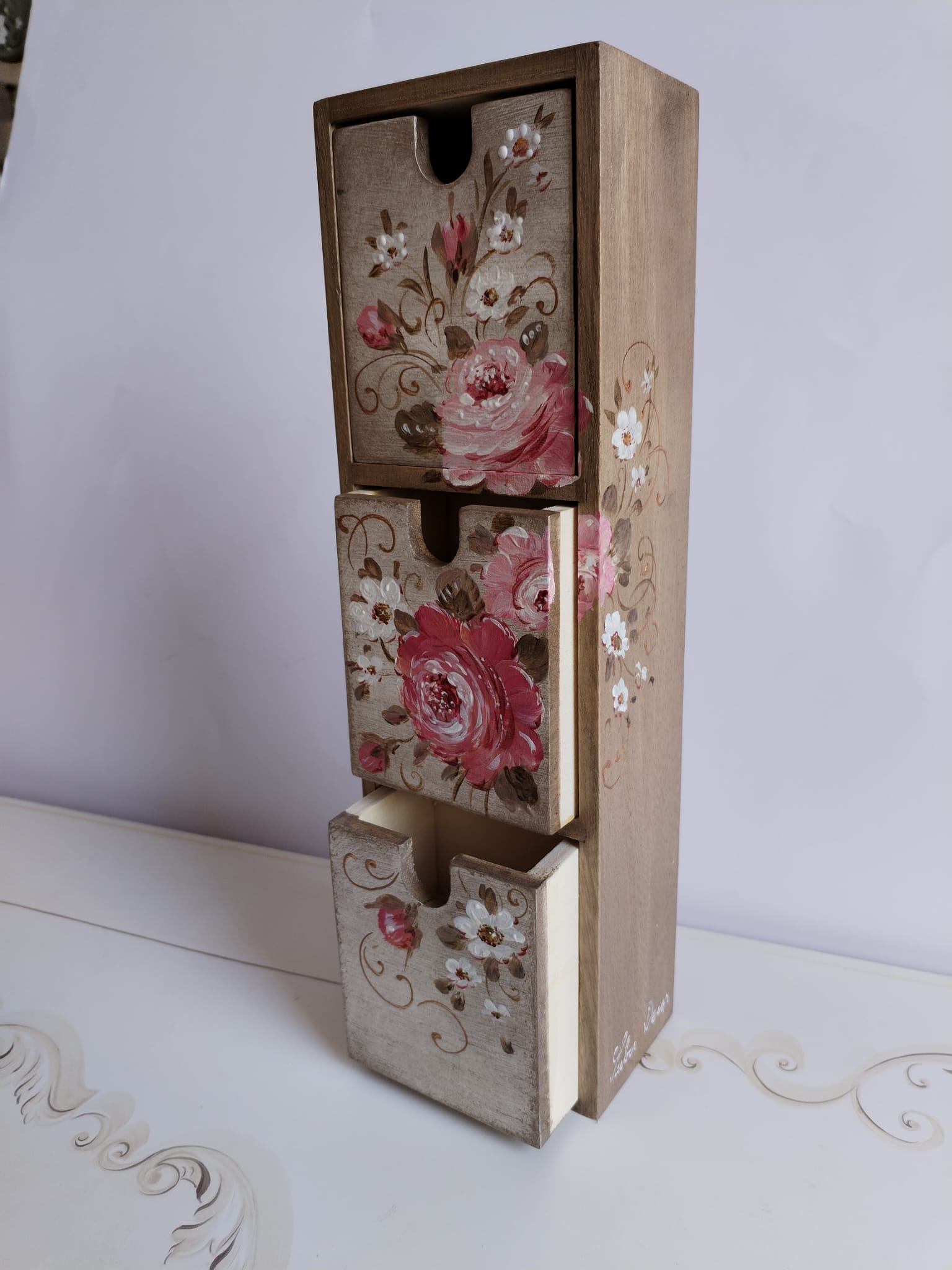 Suport pentru plicuri de ceai din lemn, cu trei sertare, pictata si patinata manual cu trandafiri si auriu antichizat. Cele trei sertare mici sunt speciale pentru depozitarea plicurilor de ceai, care ajuta la organizarea bucatariei. Se poate pune pe blat, etajera sau prins pe perete. Patina aurie ii ofera un aspect vintage, iar trandafirii sunt pictati cu atentie la detalii, pentru a oferi eleganta in decorul bucatariei dvs. Poate fi un cadou ideal pentru iubitorii de ceai
